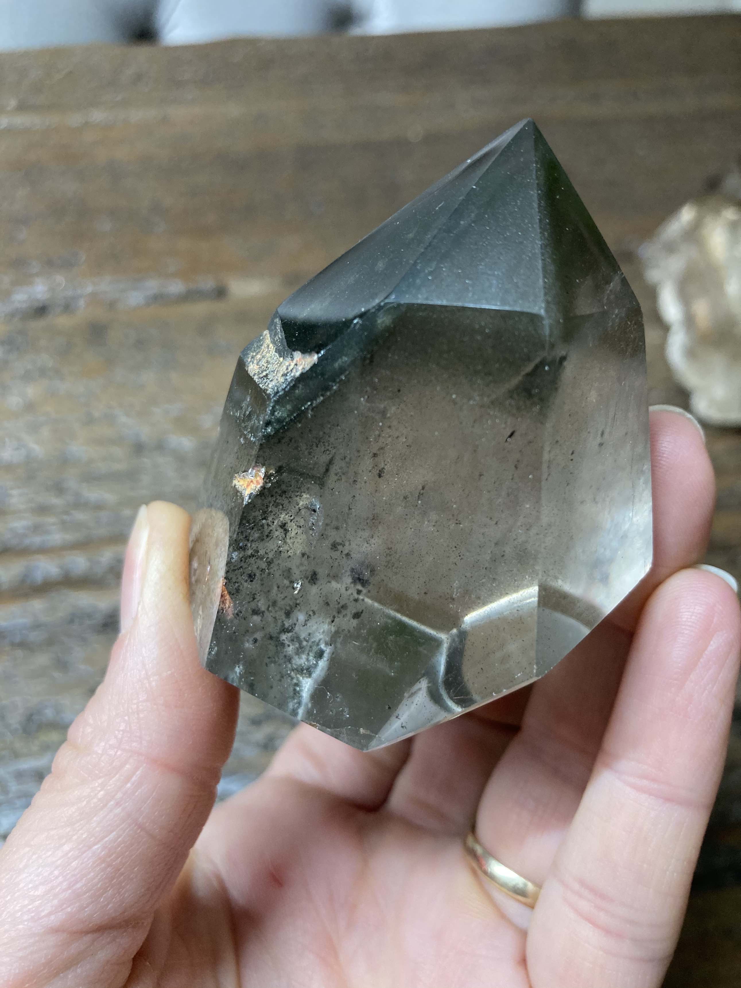 Sieht etwas aus wie Phantomquarz, auf dem Phantom vielleicht Chlorit abgelagert? Ist es grün, sieht jedenfalls bei mir so aus