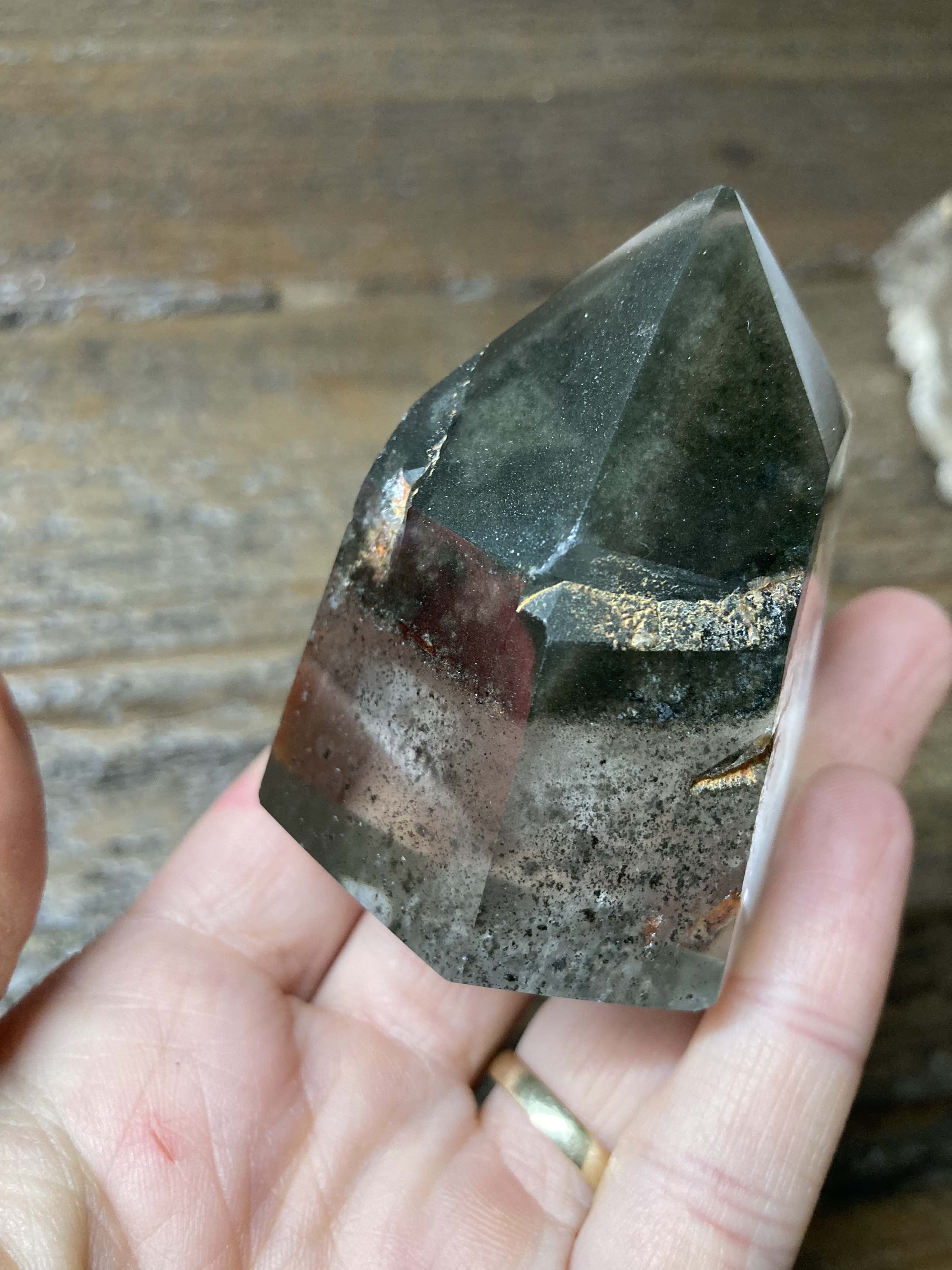 Sieht etwas aus wie Phantomquarz, auf dem Phantom vielleicht Chlorit abgelagert? Ist es grün, sieht jedenfalls bei mir so aus
