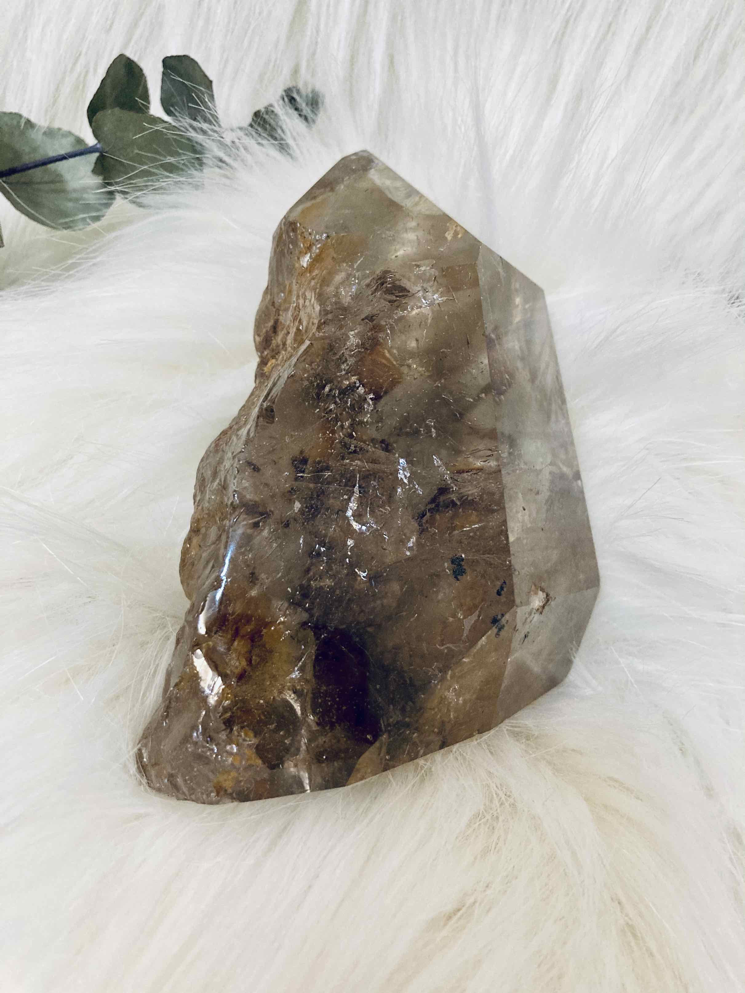 Dieser wunderschöner natürliche Rauchquarz Lodolith mit großem Regenbogen sucht ein neues Zuhause.