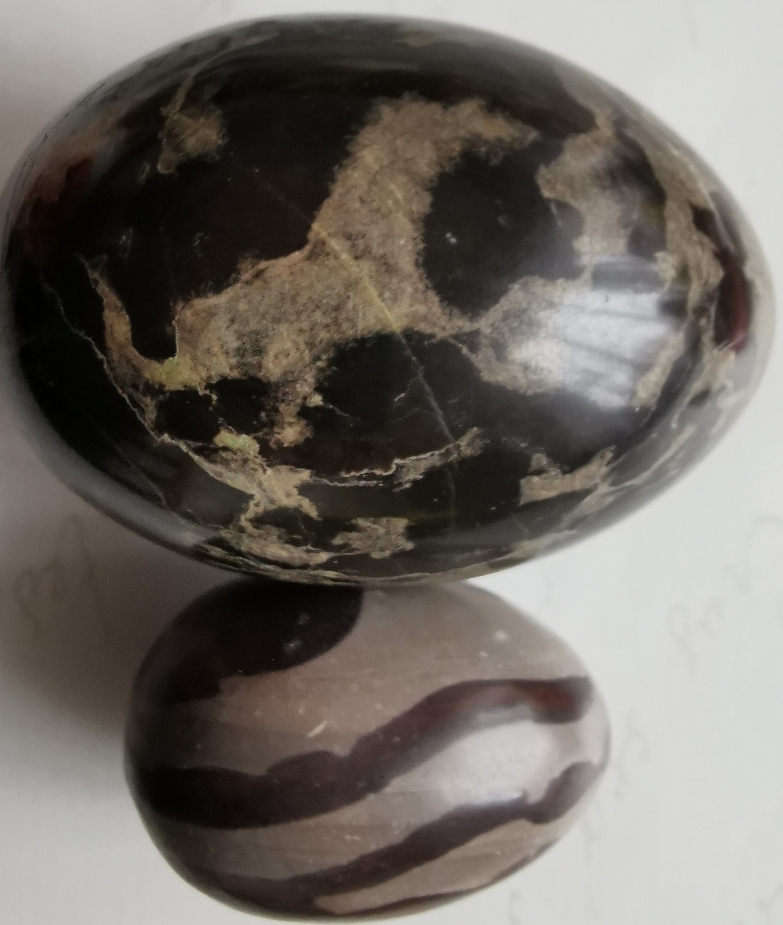 Das kleinere gestreifte Ei, was liegend auf dem Foto zu sehen ist, sieht für mich aus, wie Cappuchino-Jaspis.