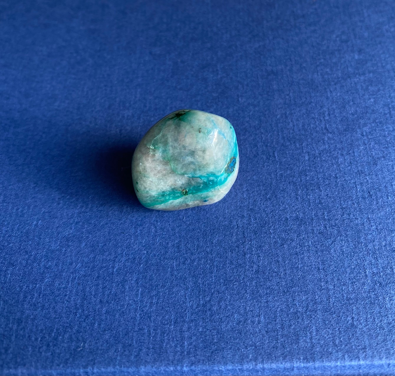 ich denke eher an Chrysokoll. Ich hatte mal so ein Mini-Steinchen, das ganz genauso ausgesehen hat. Das Graue ist das, worin der eingebettet ist. Chrysokoll in Quarz denke ich. Schau' doch mal im Internet herum und lass' Dir Bilder von Chrysokoll in Quarz anzeigen. Ist nicht soo hochwertig, wegen des hohen Quarzanteils.