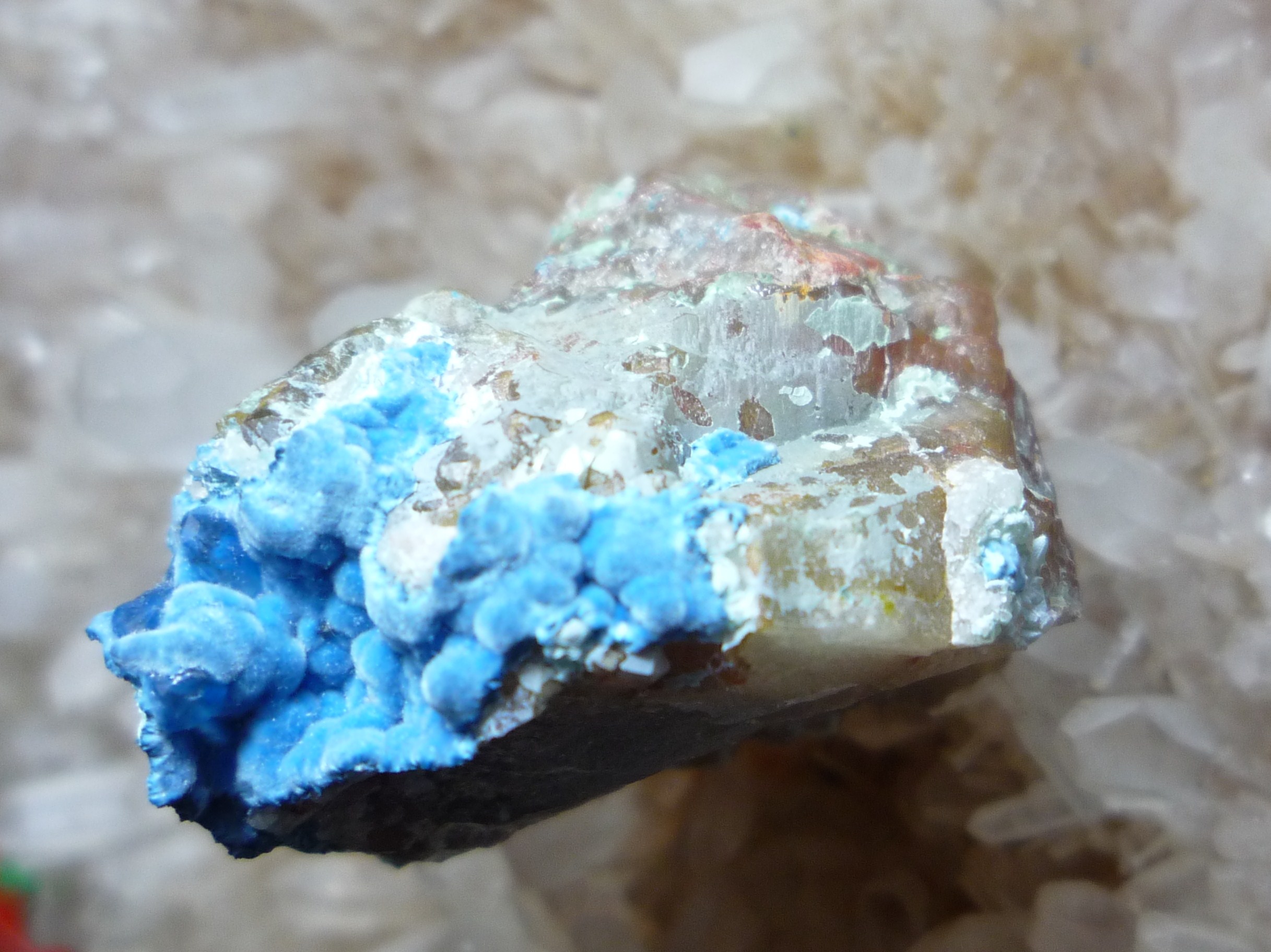 Zusammensetzung, Dunkelblau = Shattuckit, braun bis fast Scharz ist Cuprit, hellblau Chrysokoll