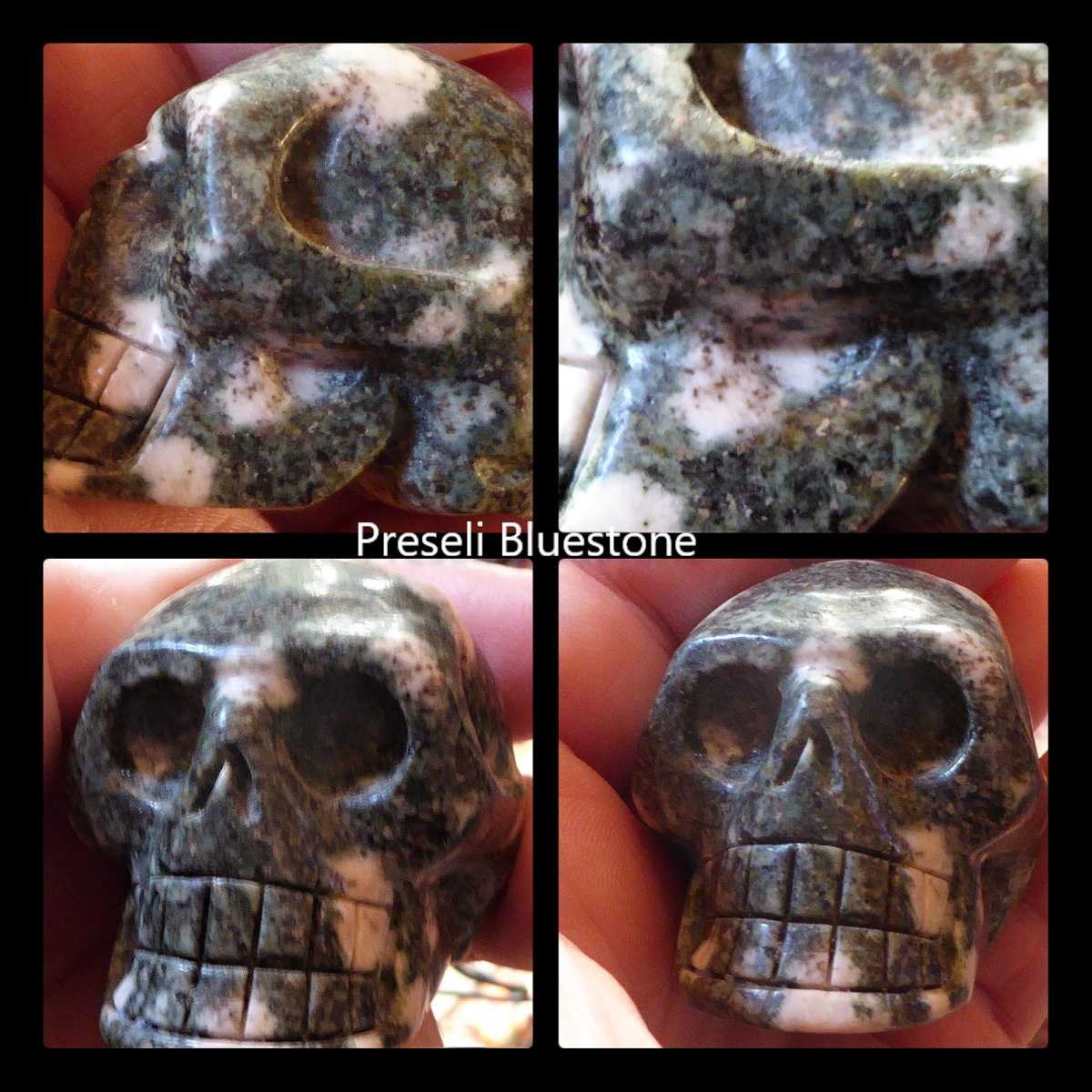 Mein Preseli-Stone ist eher dunkel-grünlich und geht nicht ins Blaue, so wie auch die meisten der im Lexikon abgebildeten.