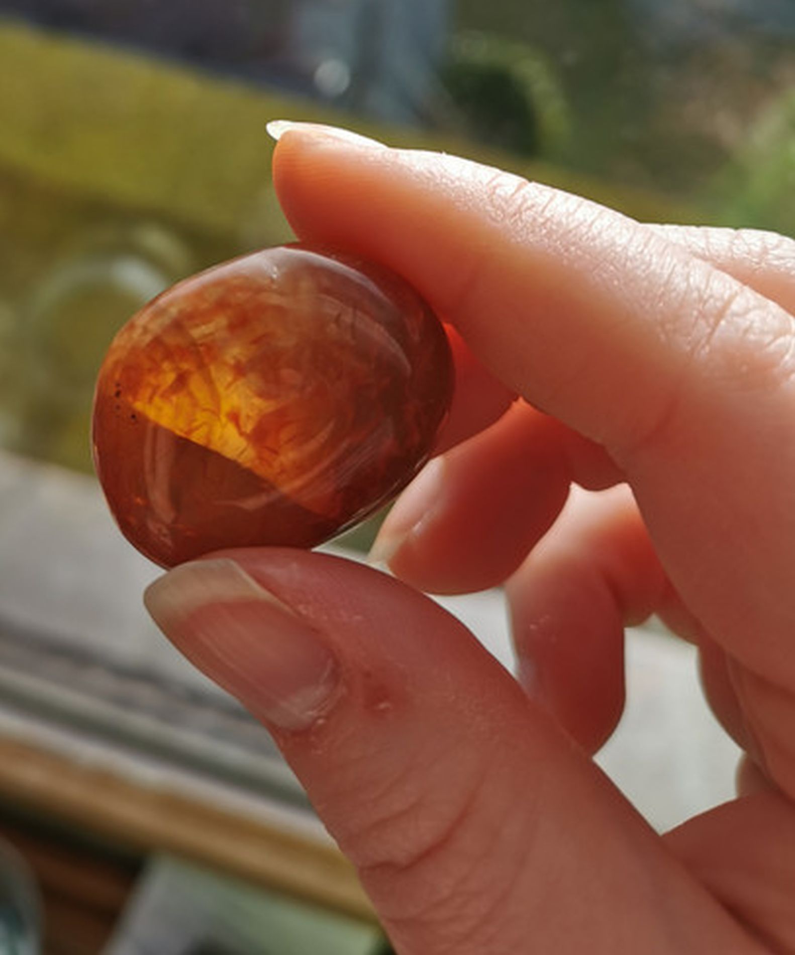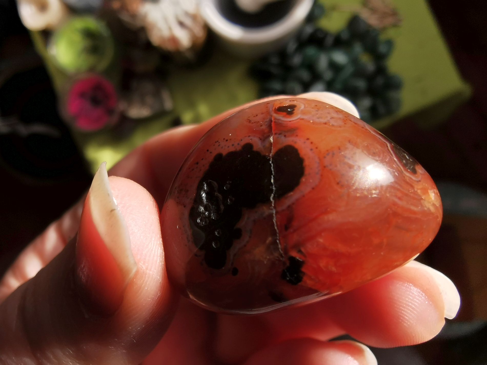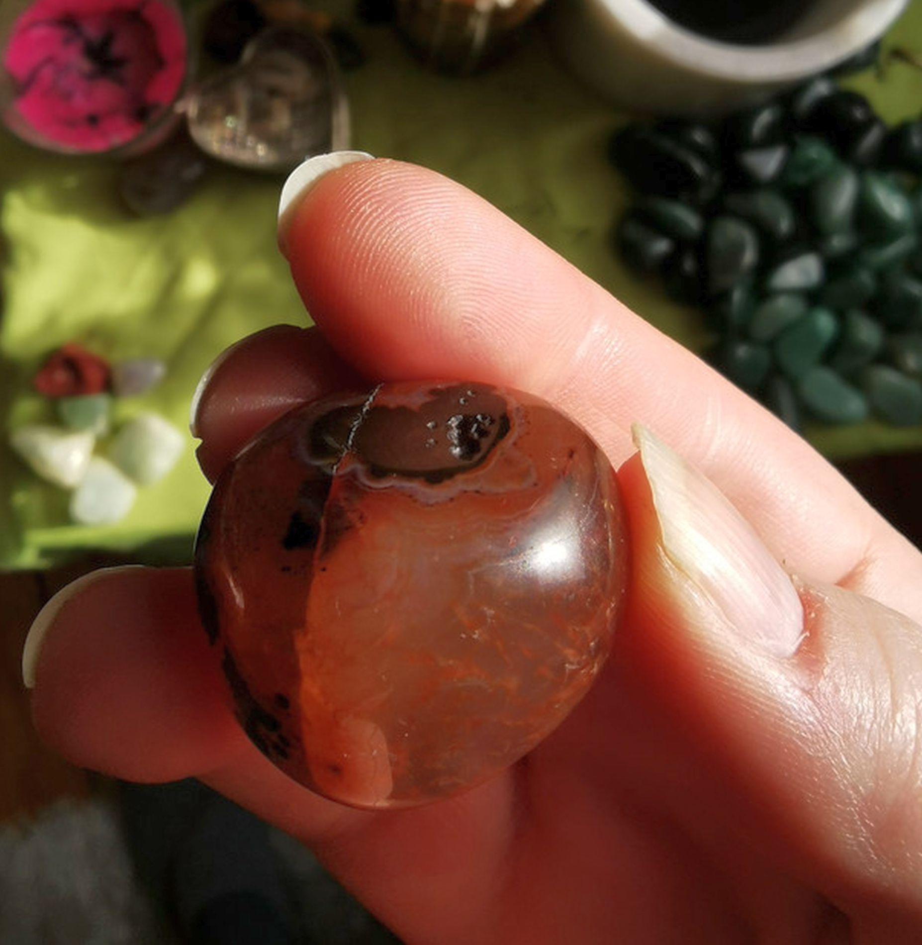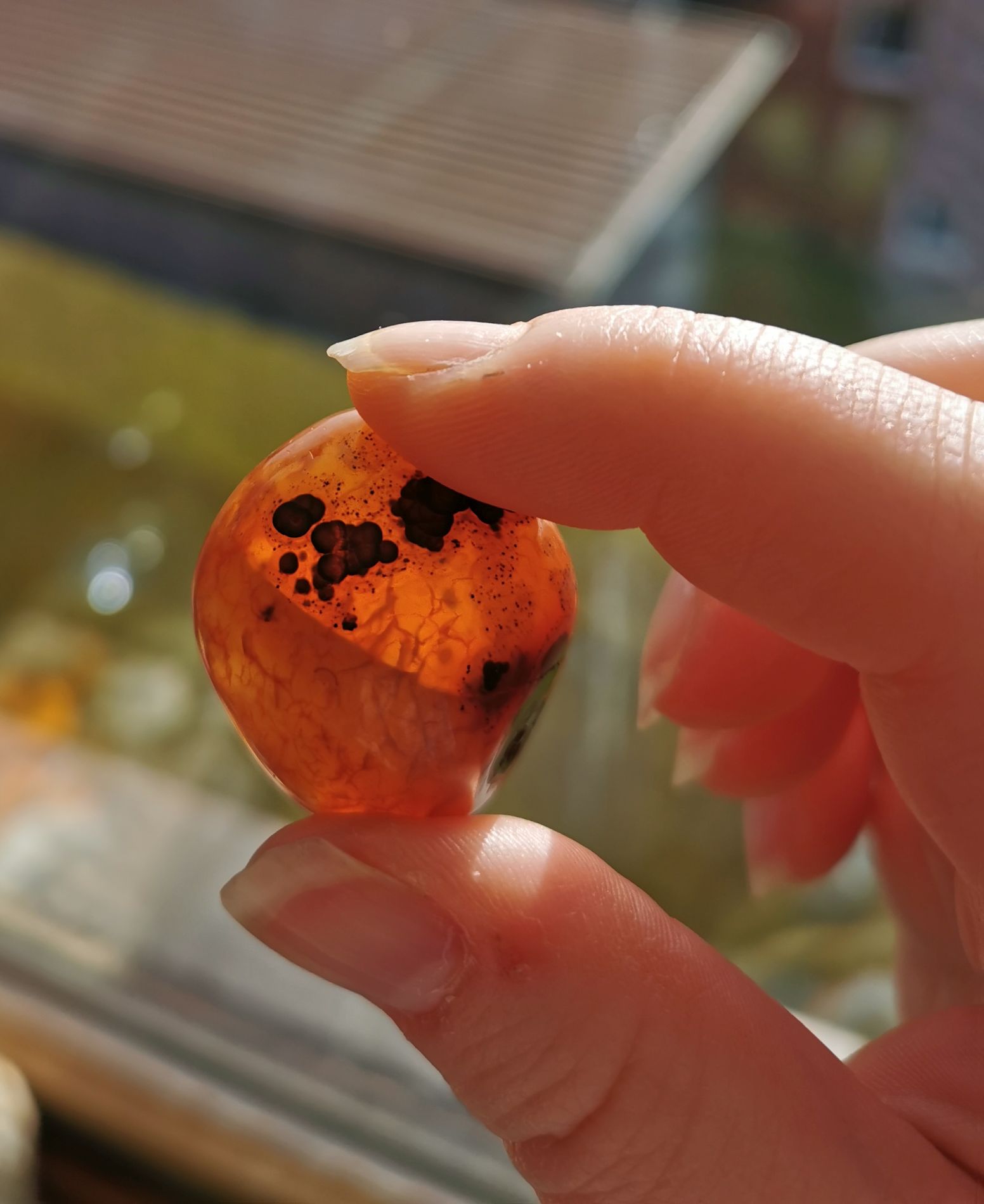 Wie man sieht ist der Stein rötlich und weist schwarz-bräunlich Flecken auf, ist dabei aber durchscheinend und hat so eine Art Bänderungsmuster sowie so kleine Härchen darauf.