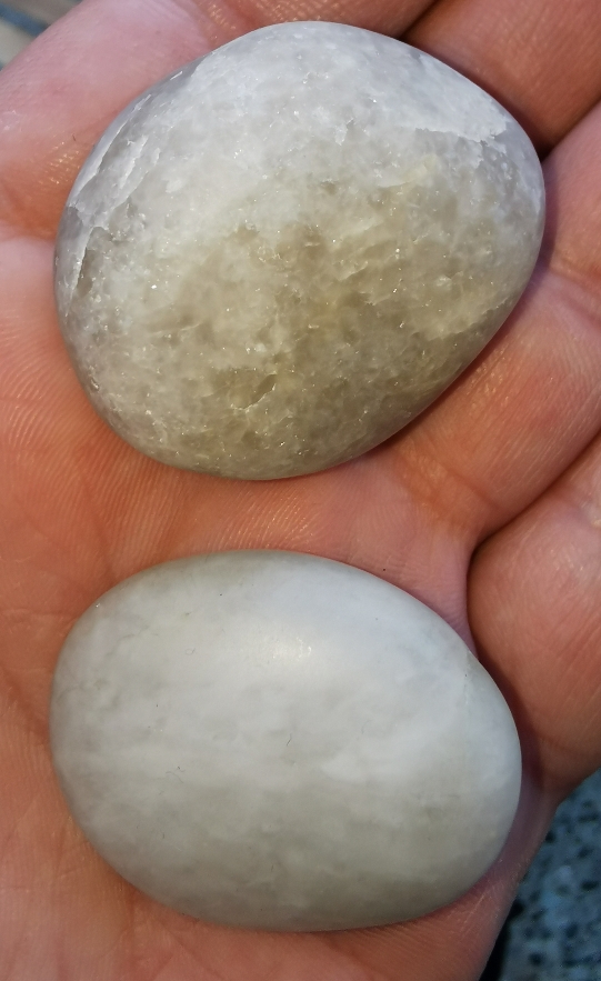Der obere ist ein gebrochener und der untere ist ein relativ rauchiger Quarz von der Nordsee