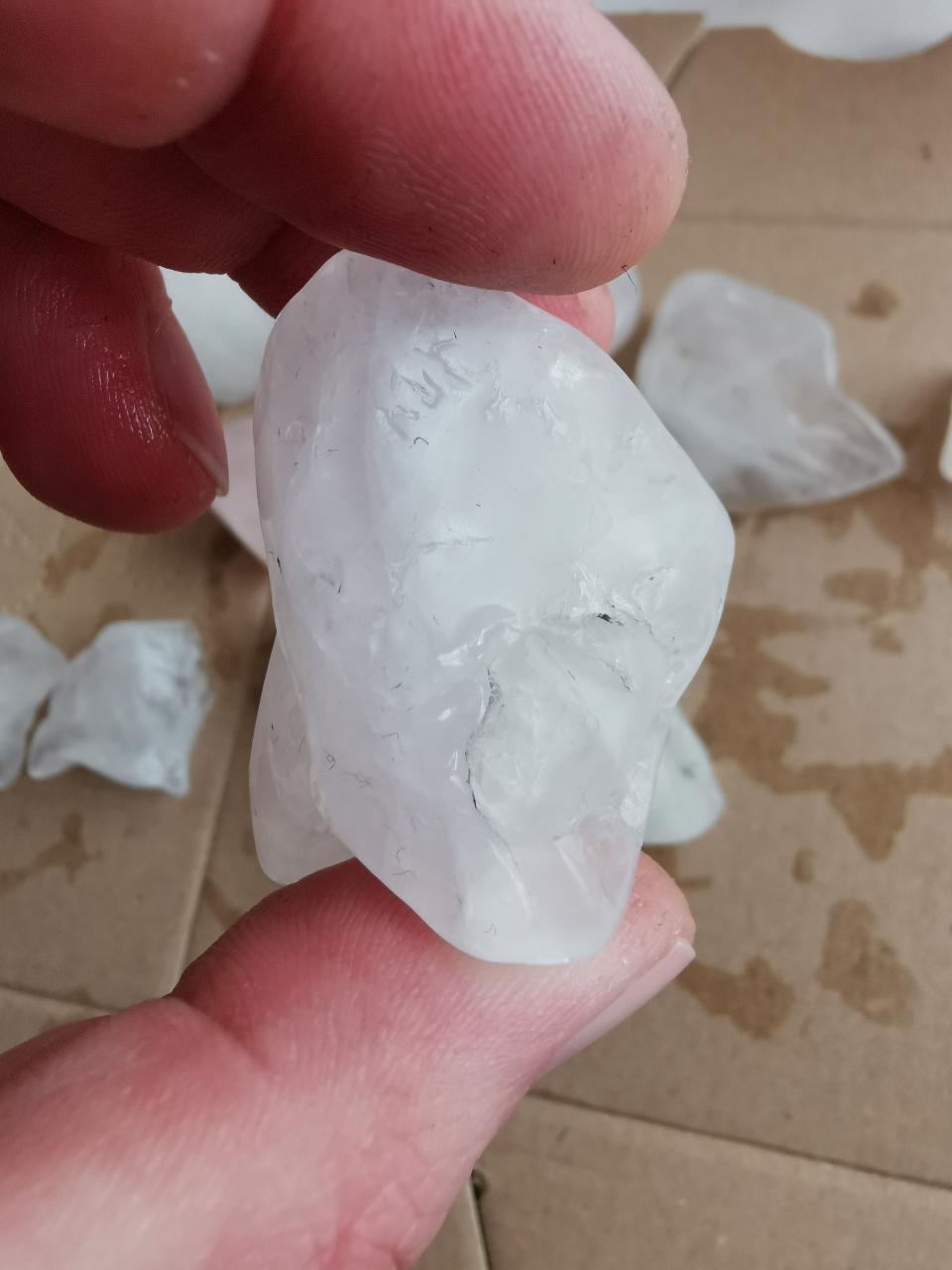 Wenn der erste Schleifdurchgang beendet ist, müssen die Steine aus der Trommel geholt und abgewaschen werden. Lieber ist ganz wichtig, dass das keinesfalls im Waschbecken gemacht werden darf! Das restliche Siliciumcarbid würde die Wasserrohre zerstören was einen Wasserschaden zur Folge hat. Eine gute Lösung ist ein Eimer Wasser, indem die Steine und auch die Trommel ausgewaschen werden kann. Dieses lässt man dann eintrocknen und entsorgt es im Restmüll. Hier mal ein Stück Quarz einmal vor dem ersten schleifen und nach dem ersten schleifen. Erst wenn die Kanten und Bruchstellen verschwunden sind, kann man mit dem zweiten Schritt beginnen. In meinem Fall kam der Stein wider in die Trommel, um den ersten Schritt zu wiederholen.