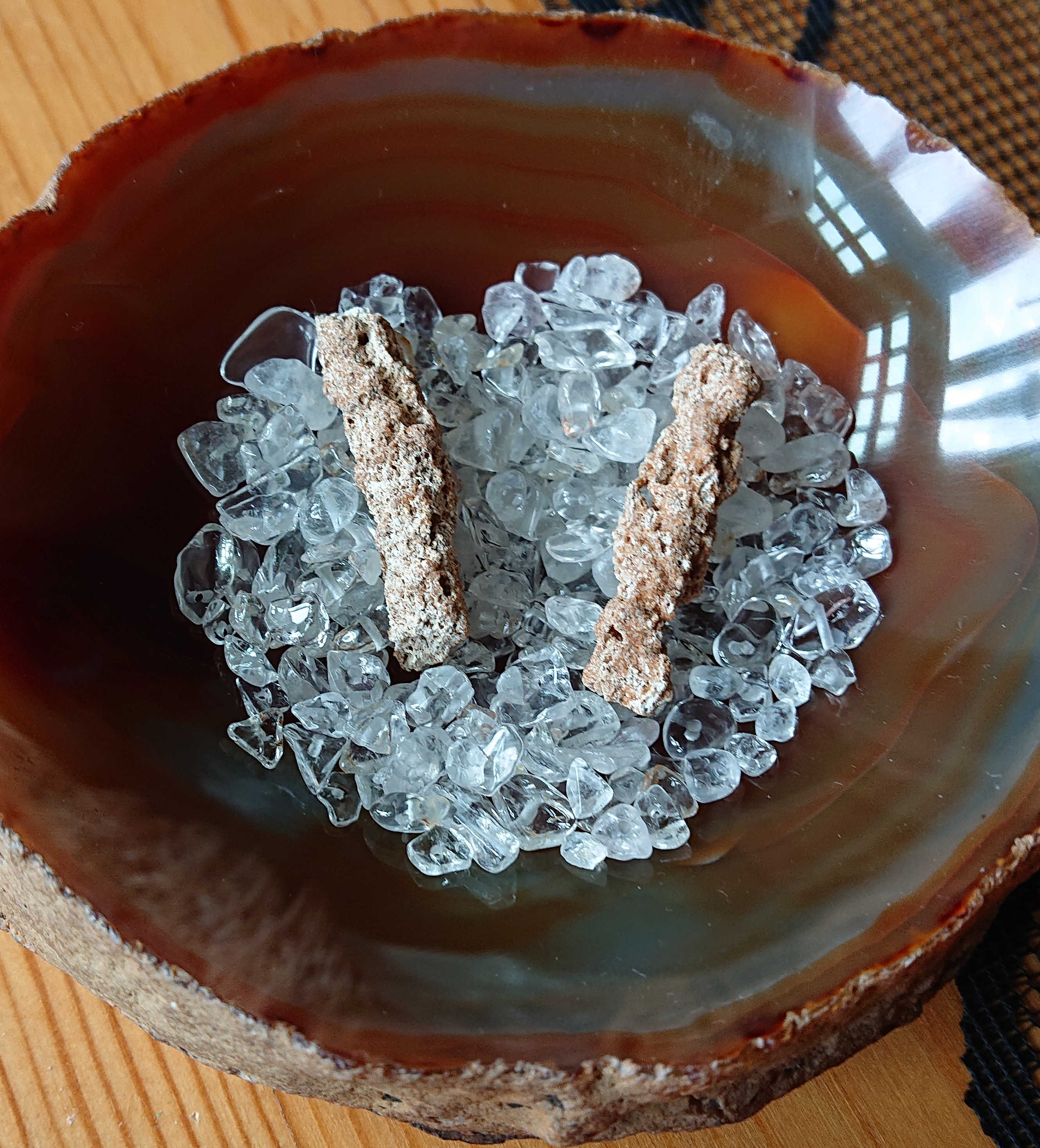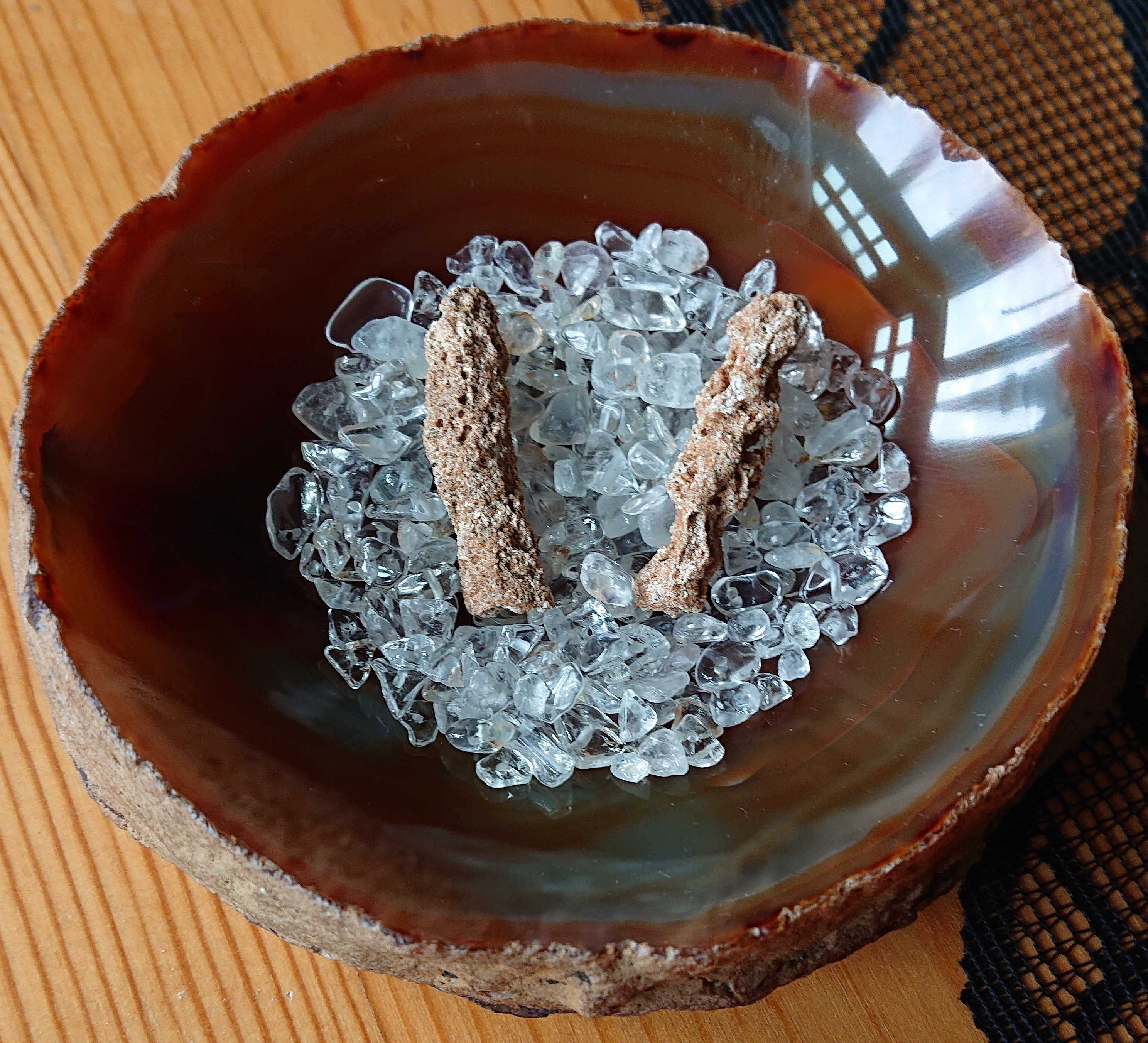 Reinigung: in Schale mit Hämatit Steinchen, aufladen im Vollmond oder in einer Schale Bergkristallsteinchen.