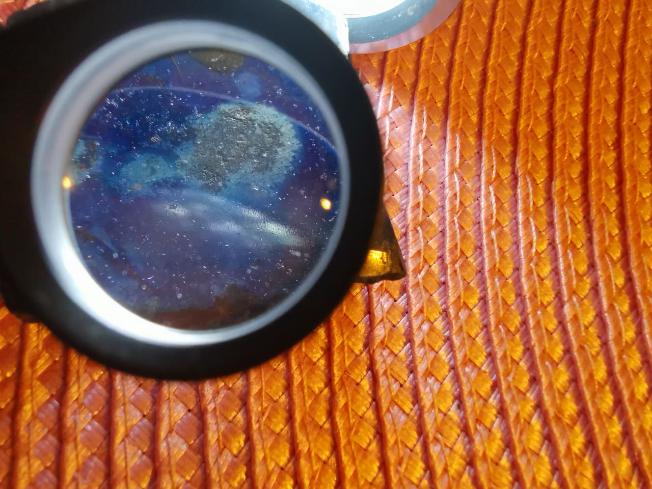 Mit einem Pyrit-Fleck (siehe Lupe). allerdings ist es für Lapis ein ganz komisch blau...