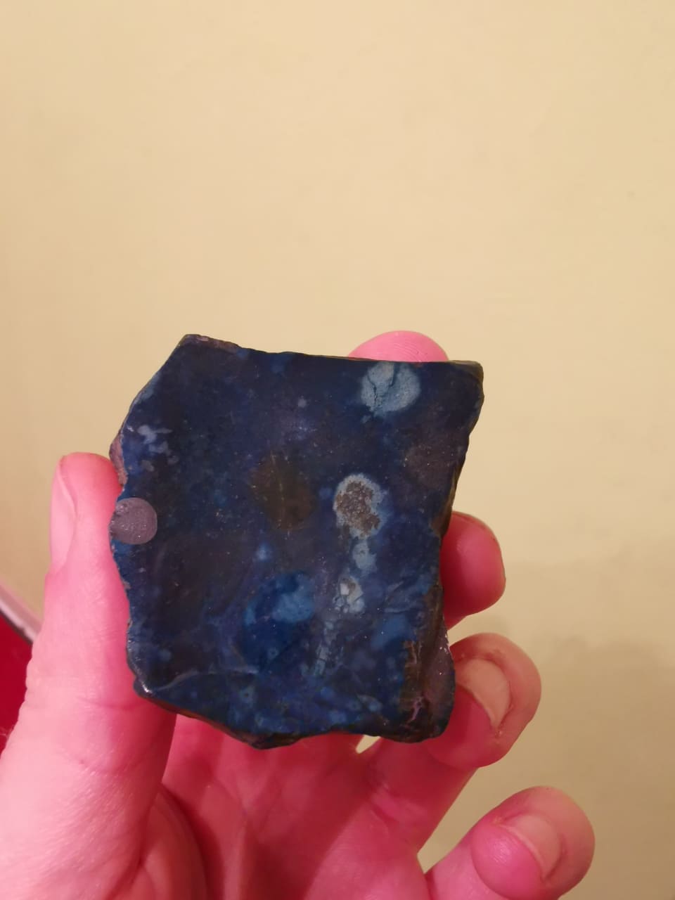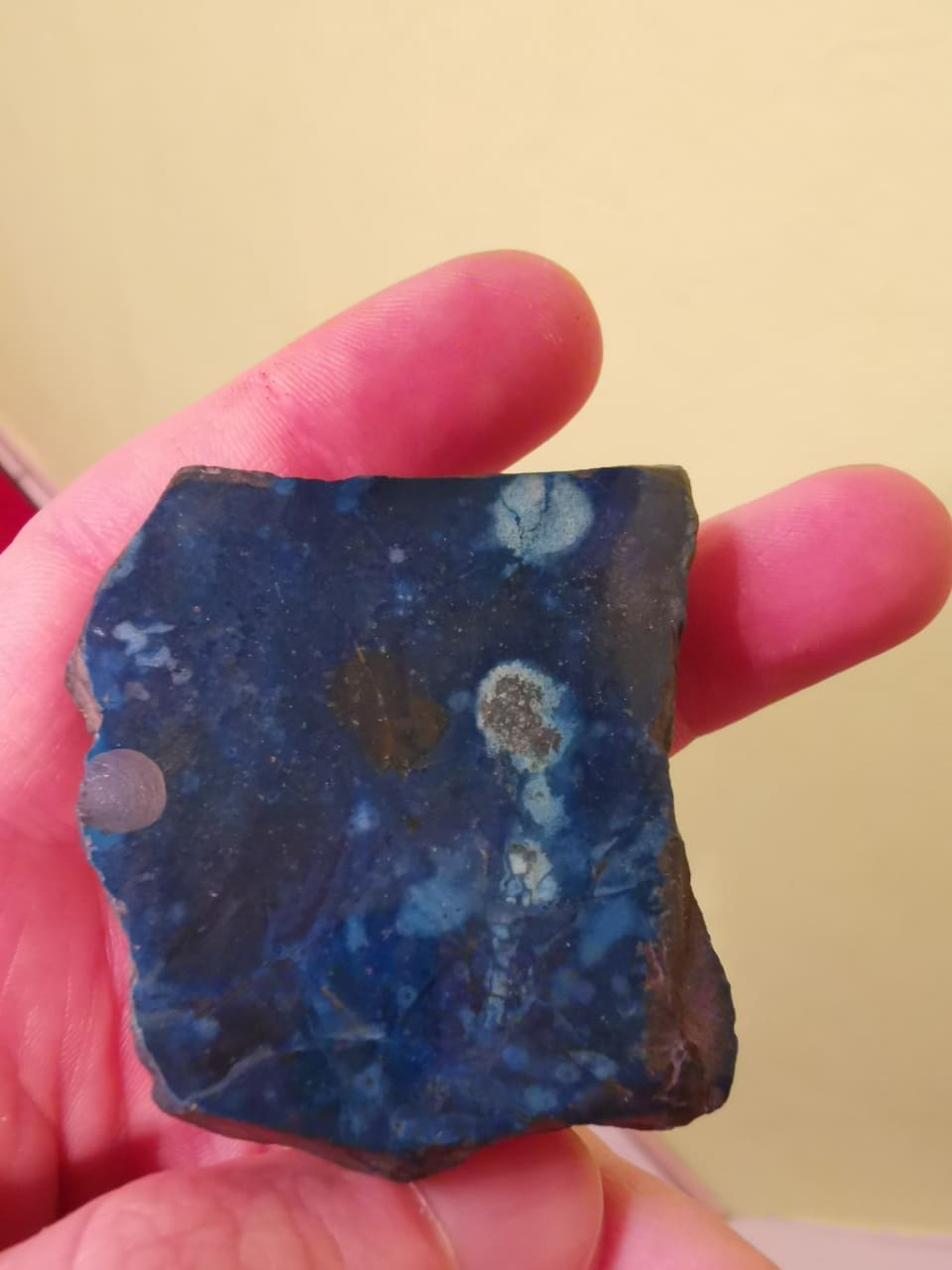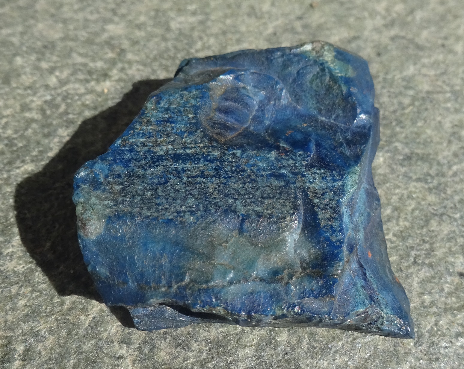 Das blau ist im ganzen Stein, auch an der abgeplatzten Stelle. Zusätzlich sind mir die roten Flecken auf der Rückseite aufgefallen