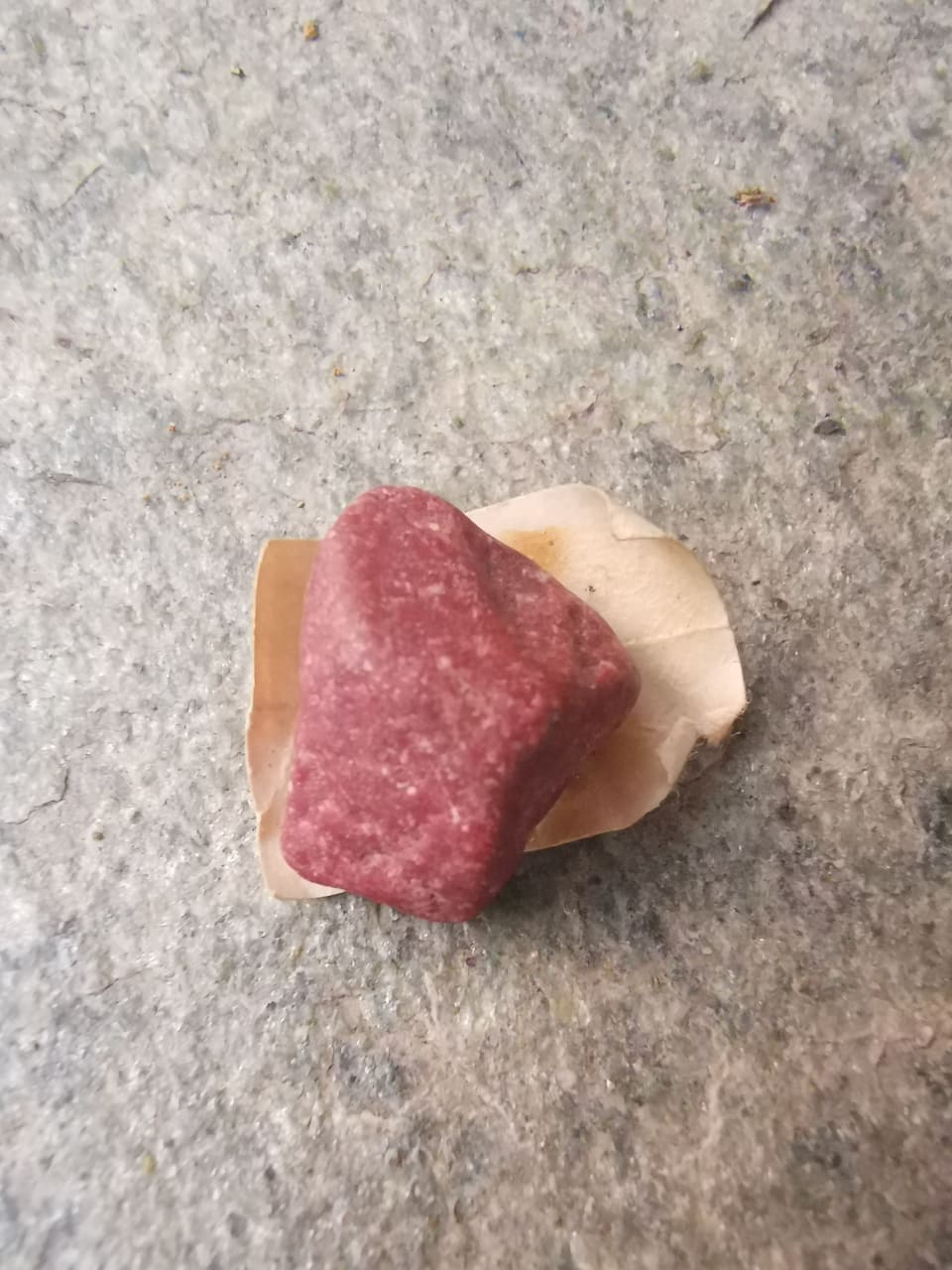 Auf den ersten Blick hätte ich an eine gefärbte und lackierte Tonscherbe gedacht, zumal es auf dem ersten Bild neben deinem Daumen so aussieht, als wären da Farbe und Lack abgeplatzt, aber ich bin mir nicht sicher, ob da nicht vielleicht die Farben täuschen.