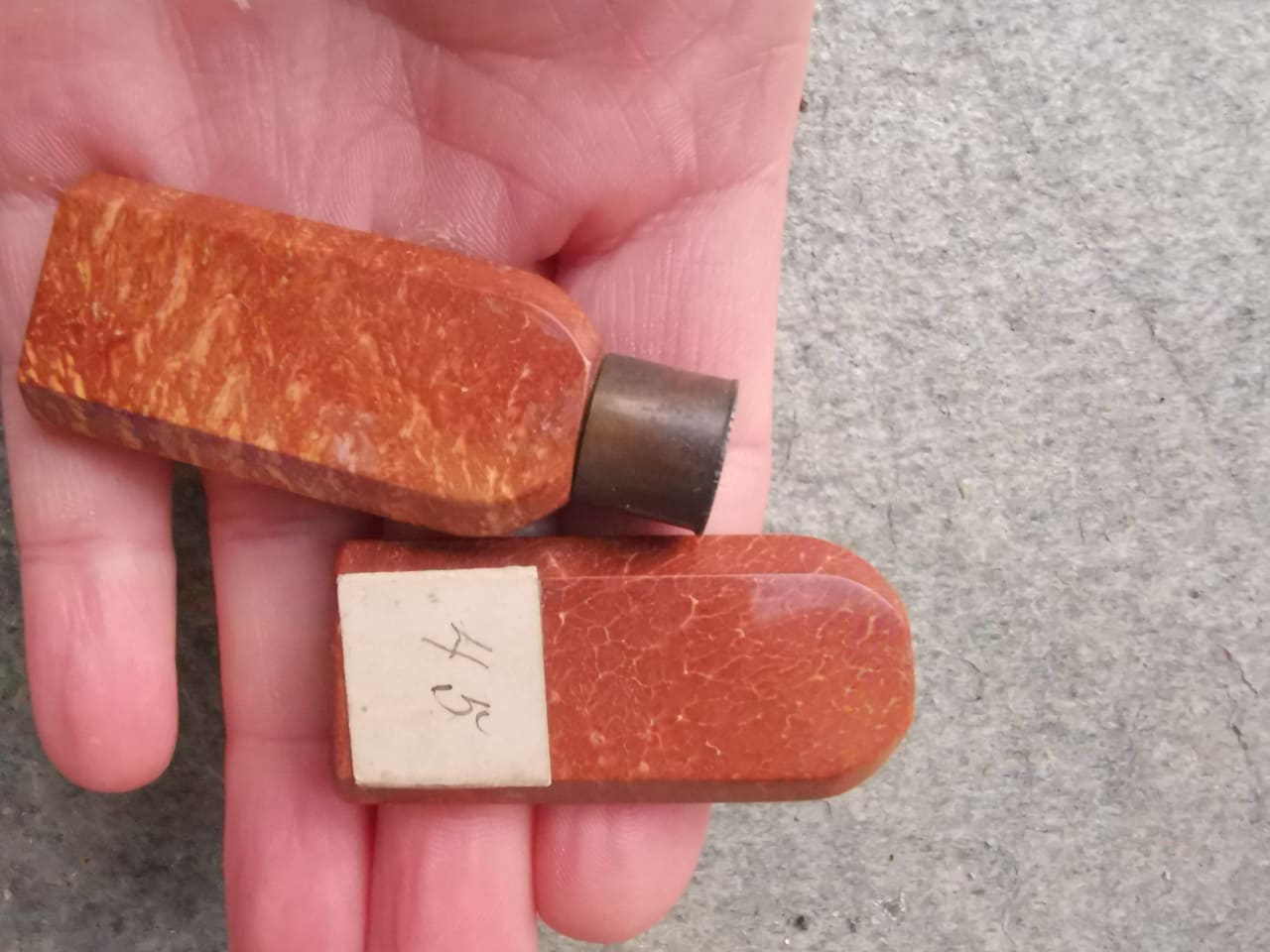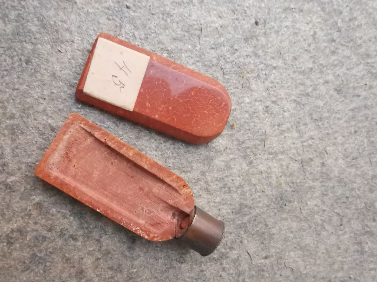 Danke für die Detailfotos. Hm, das sieht aus, als wären die beiden Hälften mal zusammen gewesen. Sicher war da mal irgend etwas darin verborgen. Aber von der Steinart finde ich das auch sehr schön. Hat was vom Sonnenstein oder ähnlichem.Die "Flasche" weiß ich auch nicht...