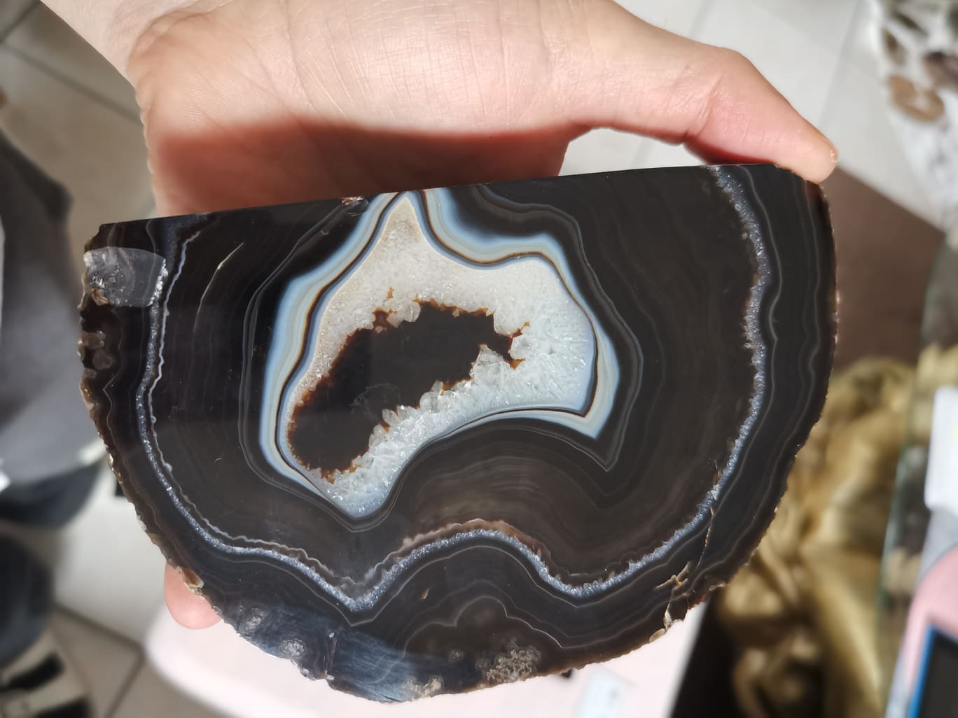 Bei gefärbtem Achat sieht das Gestein, also die "Kruste" häufig auch so farbig aus wie der Achat.