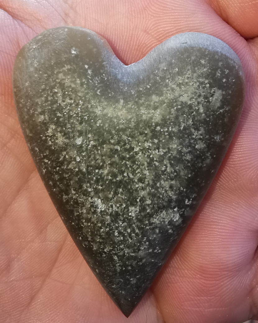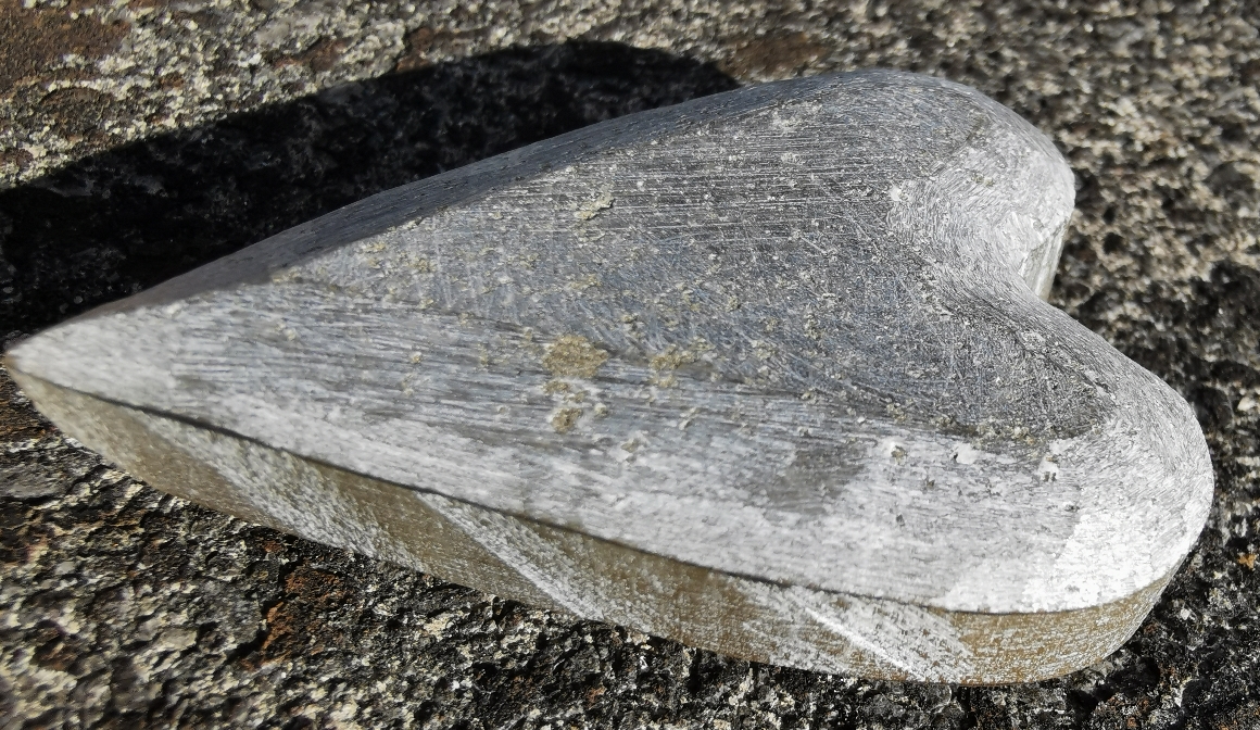Auch von der Seite habe ich ihn gut hinbekommen. Die Risse, die er hat, gefallen mir richtig gut! Dafür, dass es der hässlichste Stein war, finde ich ihn als Herz sehr schön. Ich glaube, ich hätte ihn im polierten Zustand so nicht in die Vitrine gestellt.