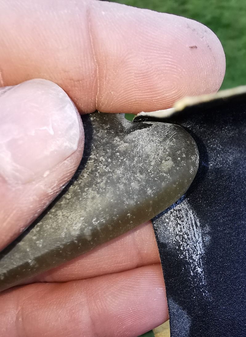 Die Seiten habe ich im spitzen Bereich ordentlich rund bekommen. Es sind noch ein paar kleine Unebenheiten, die jedoch im nächsten Schleifvorgang verschwinden werden.