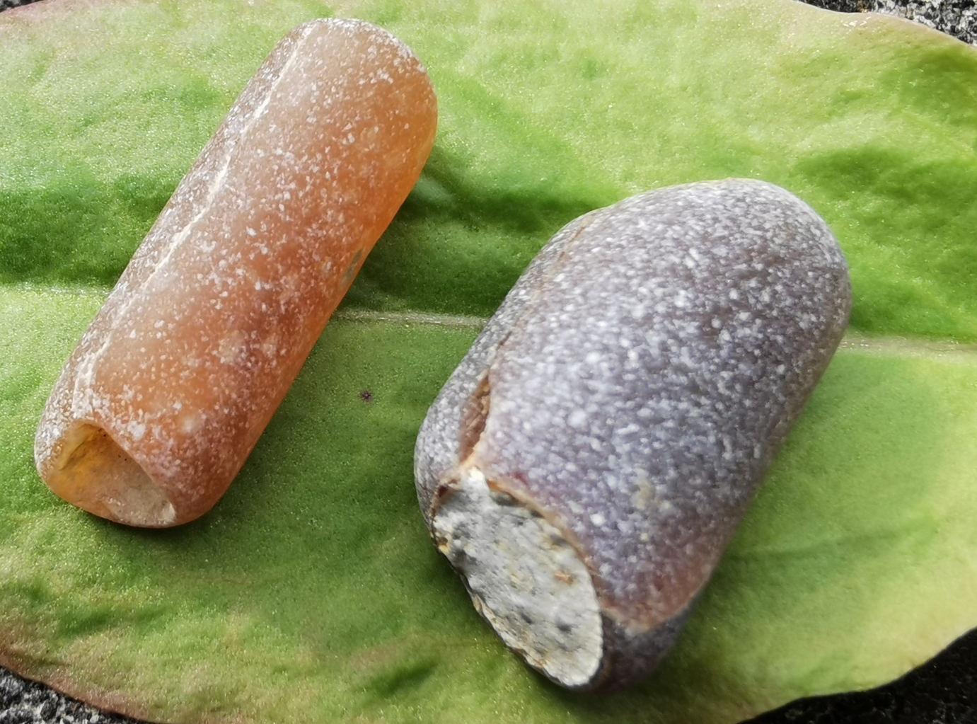 Innen mit festem Sediment gefüllt bzw. einmal ohne. Sie sind durchscheinend und ca. 2,5 auf 0,4 cm groß.