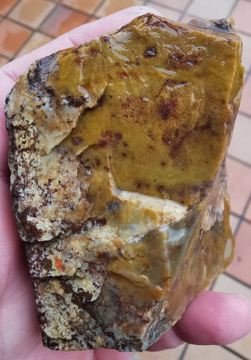 Ich habe mal zwei Scheiben abgeschnitten und geschliffen. Noch nicht poliert, deshalb nass fotografiert.