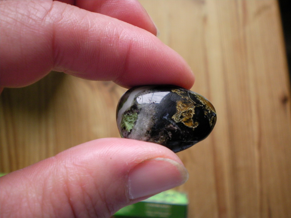 Ich trage heute, nach sehr langer Zeit, mal wieder meinen Mischling, den Mineralicon als quarzhaltiges Mineral/Chalcedon mit Chlorit und Onyxansätzen bezeichnete, einfach so, weil ich da Lust zu habe. Oder, wer weiß, vielleicht brauche ich ja auch gerade diese Kombination ;-)