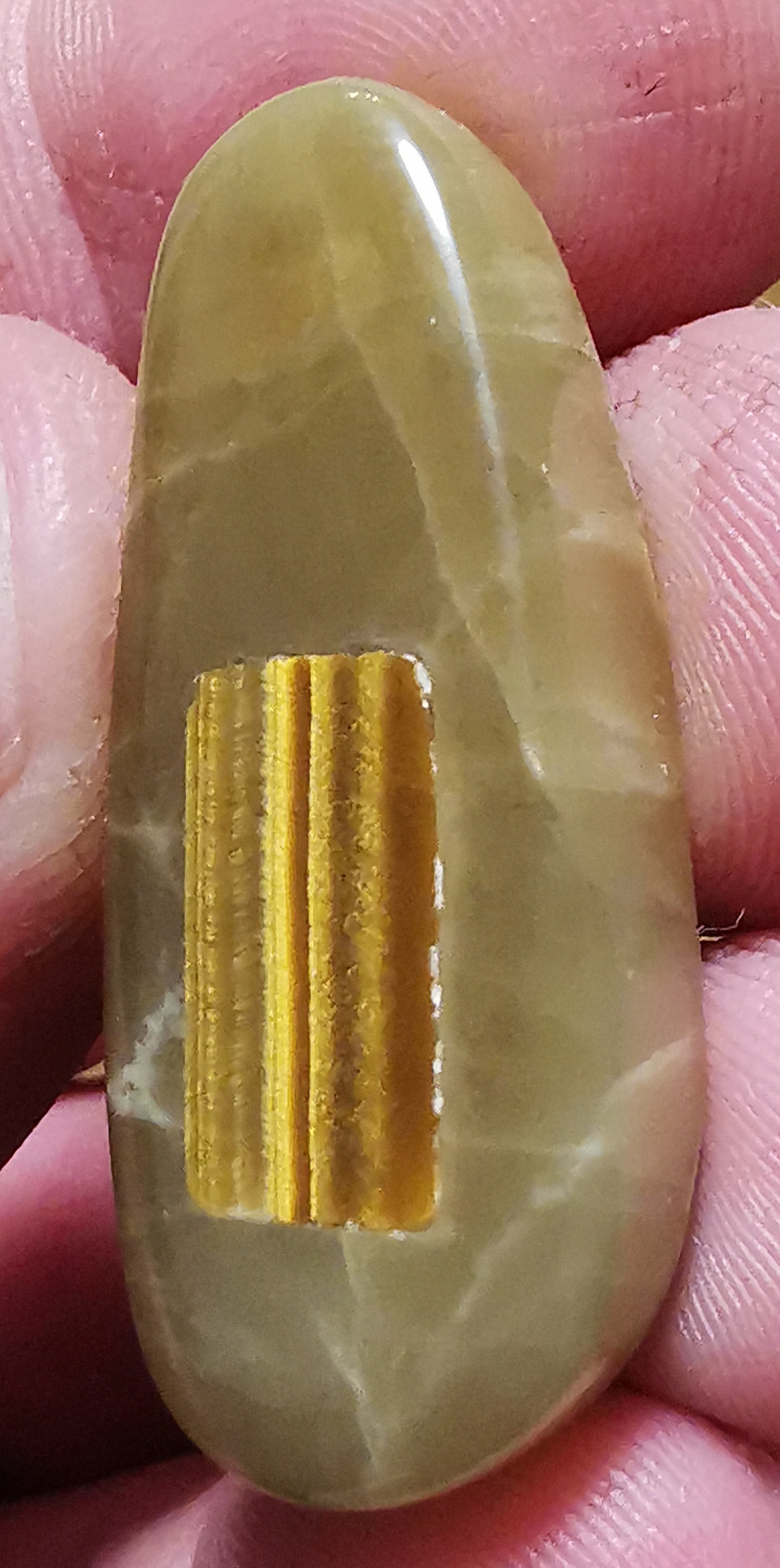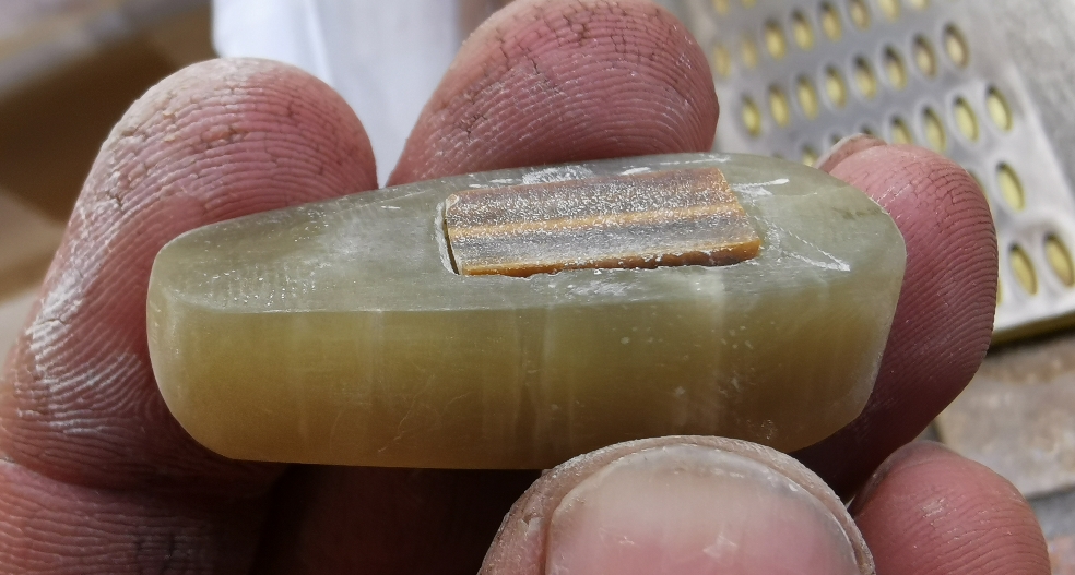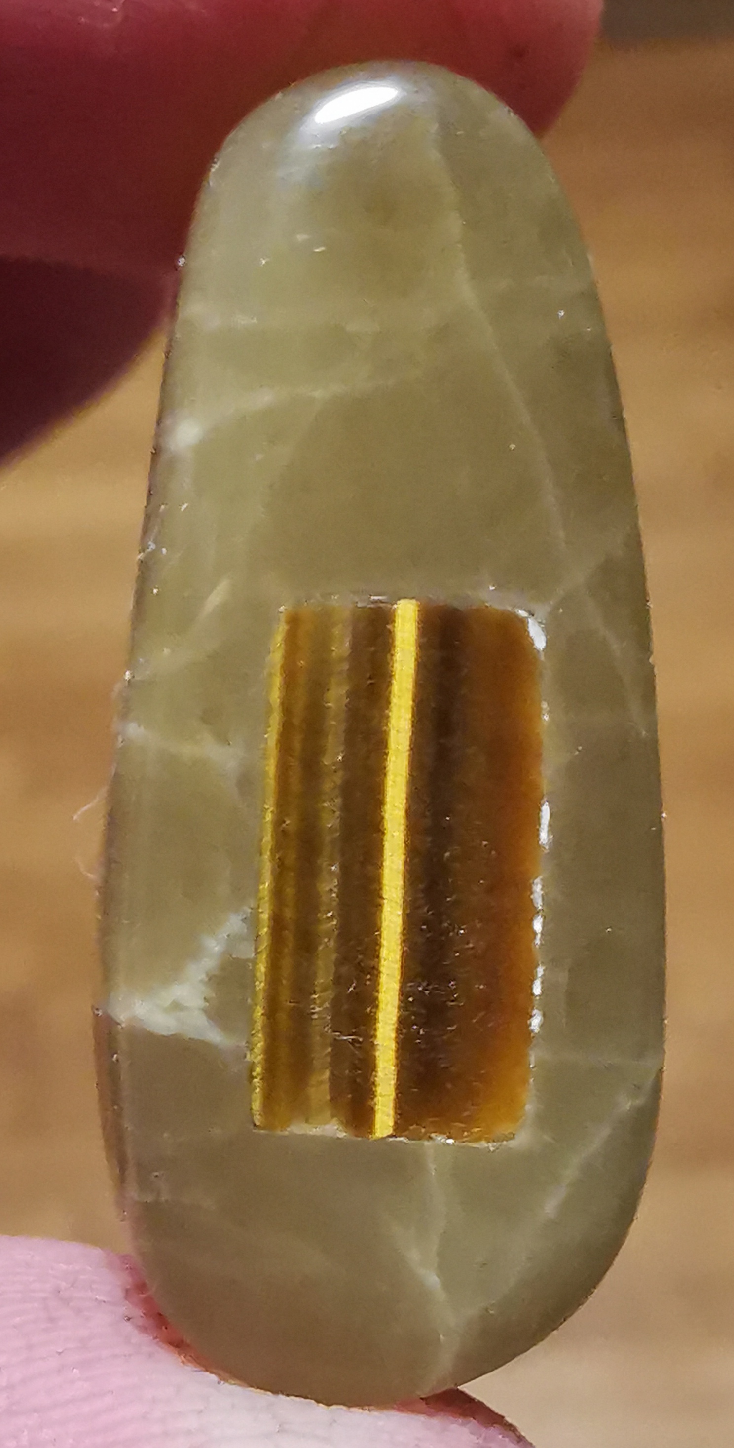 Zum Festkleben habe ich den Stein etwas hineingedrückt und schon ist es passiert. Der Tiegerauge ist an eine Ecke leicht abgeplatzt. Mal sehen, was nach dem Glattschliff davon noch zu sehen ist.