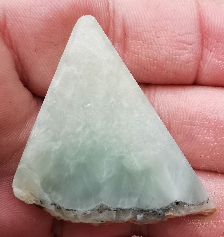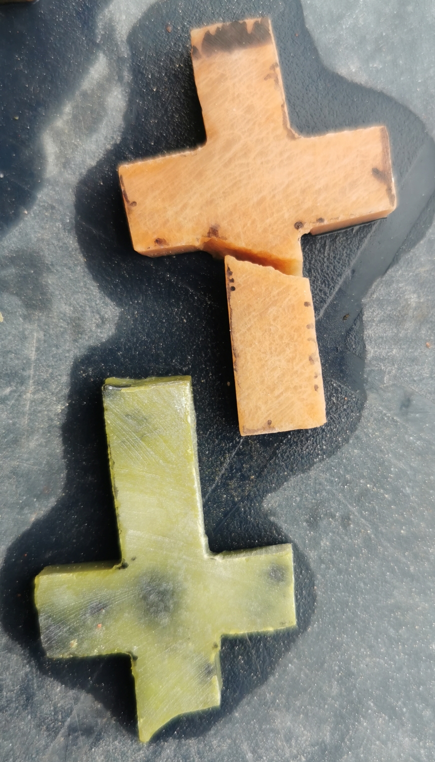 Mal als Beispiel ein Prehnit Kreuz, geschliffen (noch nicht ganz fertig) und direkt nach den aussägen. Gerade bei diesem Stein hat man sehr viel Nachbearbeitung, da die Kanten beim sägen sehr splittern.