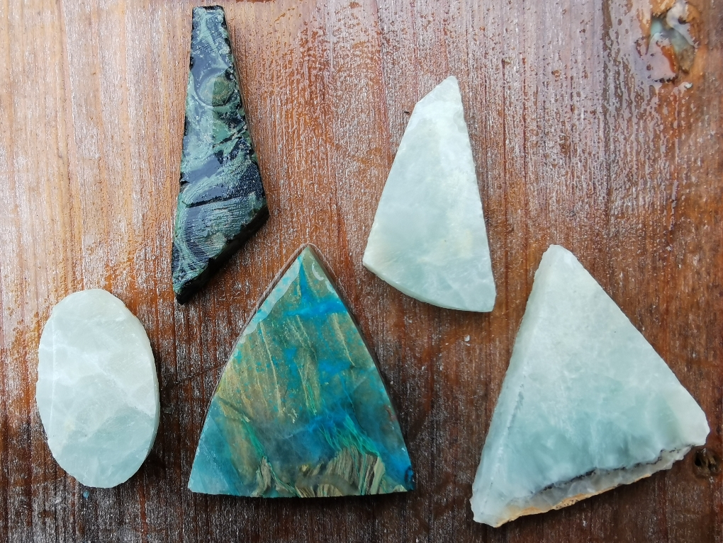 Was bei dem einen Stein gut geht, geht bei dem anderen wiederum schlecht...Durch die unterschiedlichen Steine lerne ich beim Bearbeiten selbst sehr viel. Manche Steine, wie z.B. der Prehnit lassen sich schrecklich Sägen, wobei man ihn sehr gut schleifen kann. Allerdings ist dieser wiederum fürchterlich zu polieren und er will nicht so, wir ich das will.Und man sieht deutlich den Unterschied vor und nach dem Schleifen, wie z.B. bei dem roten Kreuz.
