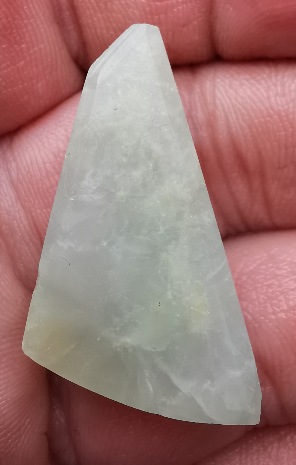 Die Form Nr. 10 ist nur bedingt geeignet. Ich habe ein Dreieck ausgesät und dieses dann (rechts) leicht schräg geschliffen und dann noch schräger geschliffen. Links ist es glatt, ohne abschrägung. Die kleine linke schräge ist in Wirklichkeit die flache Oberseite. Ich glaube jedoch, Obsidian und Tigerauge sind die einzigen wo das passt