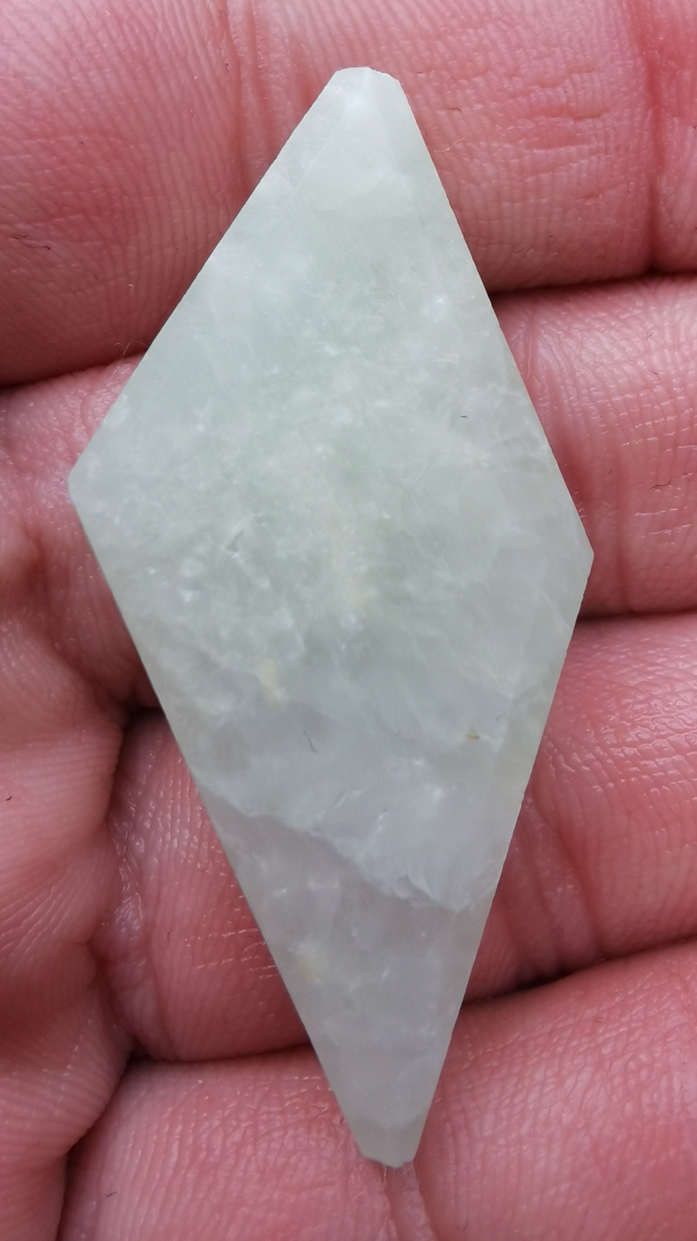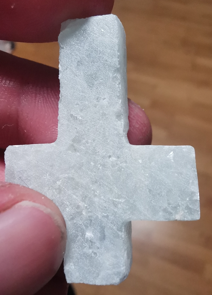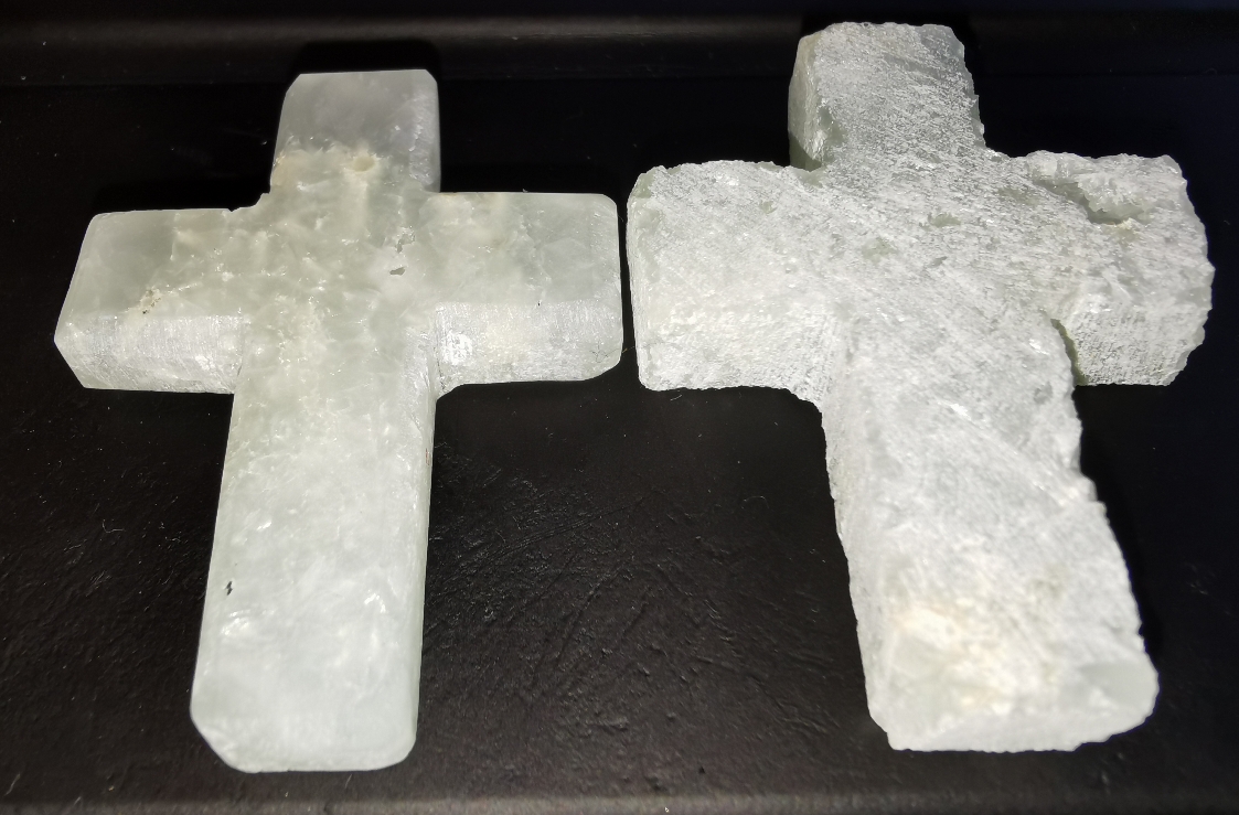 Mal als Beispiel ein Prehnit Kreuz, geschliffen (noch nicht ganz fertig) und direkt nach den aussägen. Gerade bei diesem Stein hat man sehr viel Nachbearbeitung, da die Kanten beim sägen sehr splittern.