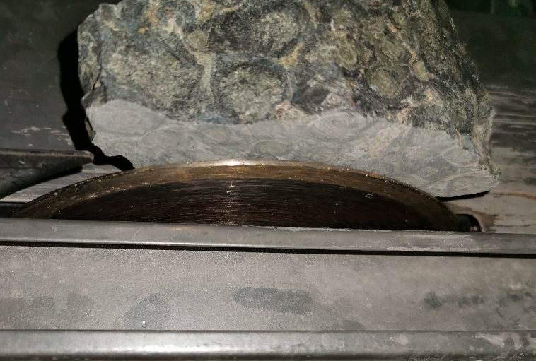Wenn man also so ein Steinchen sein eigen nennt, ist der nächste Schritt, diesen in Scheiben zu zerlegen. Ich schneide nur immer eine Scheibe, die ich direkt weiterverarbeite, da nicht jeder Stein leicht bearbeitet werden kann und einige verweigern, bei diesen Primitiven Werkzeugen, ganz ihre Haltbarkeit.