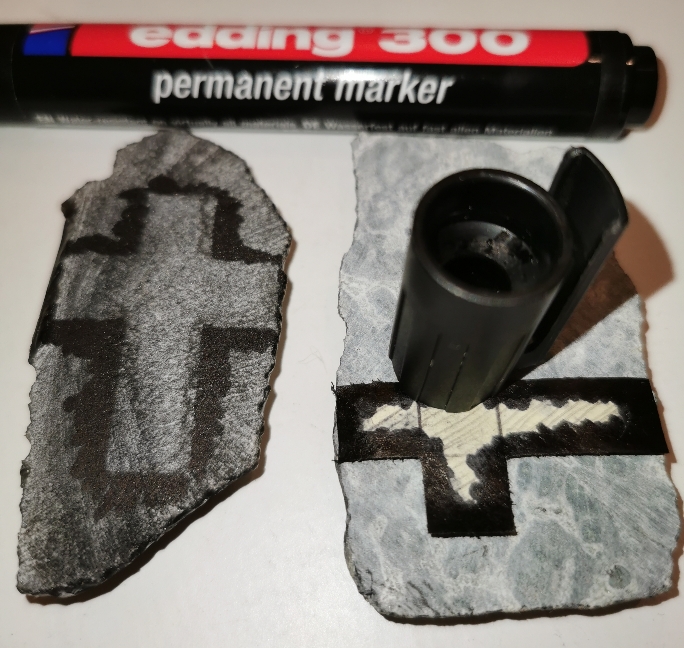 Nachdem ich nun eine Scheibe abgeschnitten hatte, habe ich mir eine Schablone aus Papier erstellt und diese auf den Stein übertragen. Da ich ja nass schneide, muss es ein wasserfester Stift sein.