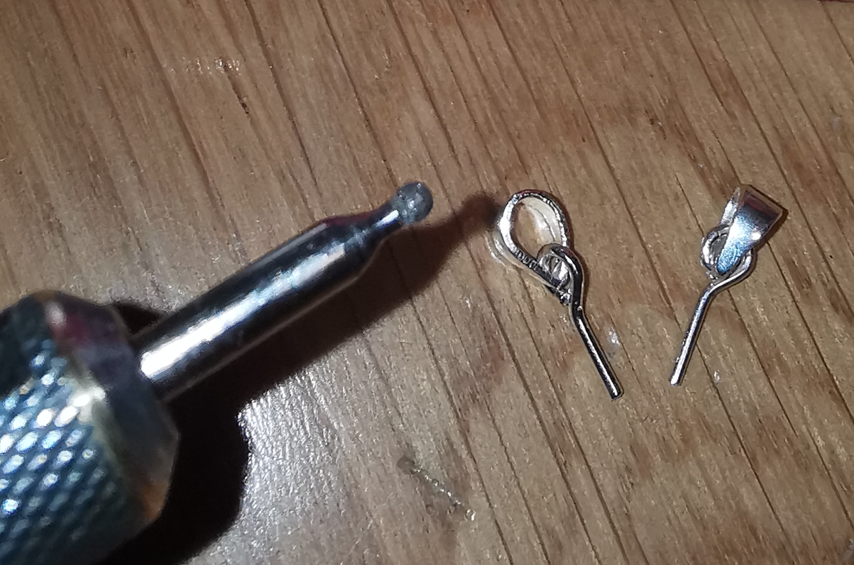 Mit einem Dremel und einem Diamant-Bohrkopf wir im Wasserbad ganz langsam ein Loch in das Kreuz gebohrt. Der Stift wird dann mit Schmuckkleber in dem Loch befestigt.
