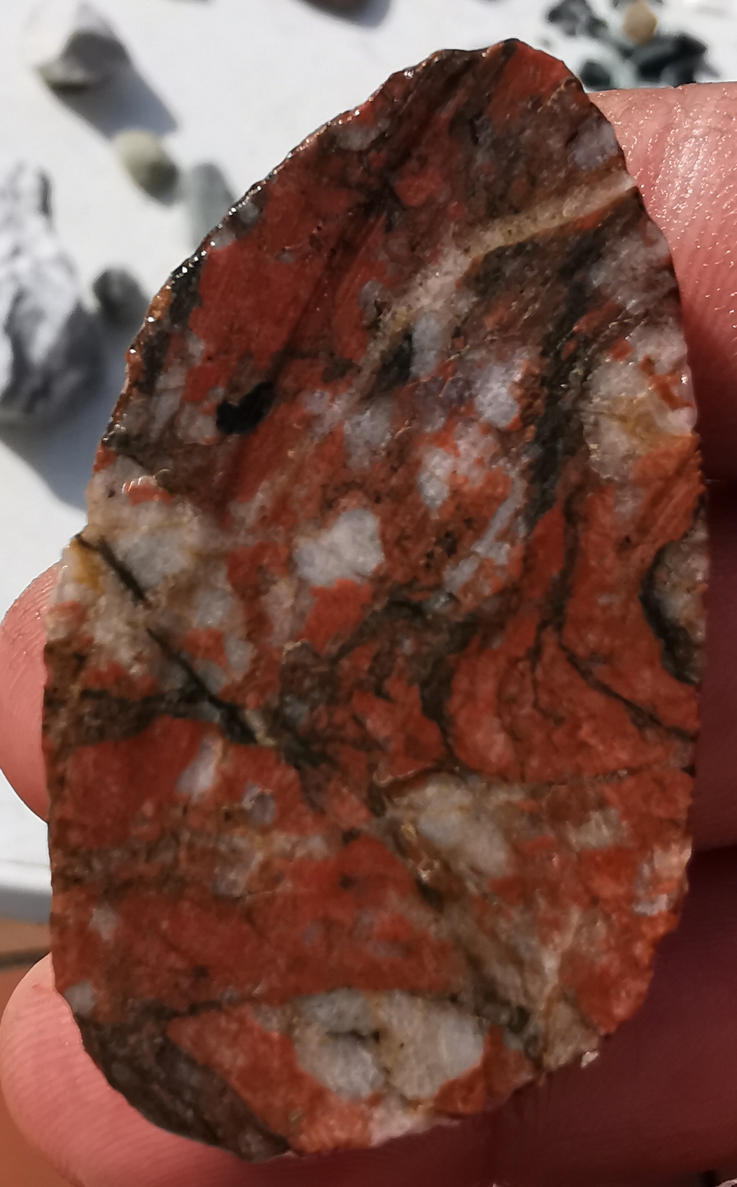 Ich habe allerdings noch so einige Steine, die ich noch gar nicht angefasst habe. Bei dem Korallenjaspis bin ich nach der ersten Scheibe auf eine kleine Druse gestoßen. Die will ich unbedingt irgendwie in einem Kreuz integrieren. Zum einen warte ich aber erstmal auf das neue Sägeblatt, damit ich sie nicht beschädigen und dann bin ich mir noch nicht sicher, wie ich das umsetzen kann, so dass es auch schön wird und die Druse in der Mitte liegt. Das würde jedoch nur gehen, wenn das Kreuz eine andere Form bekommt als ich sie sonst mache. "+"+"