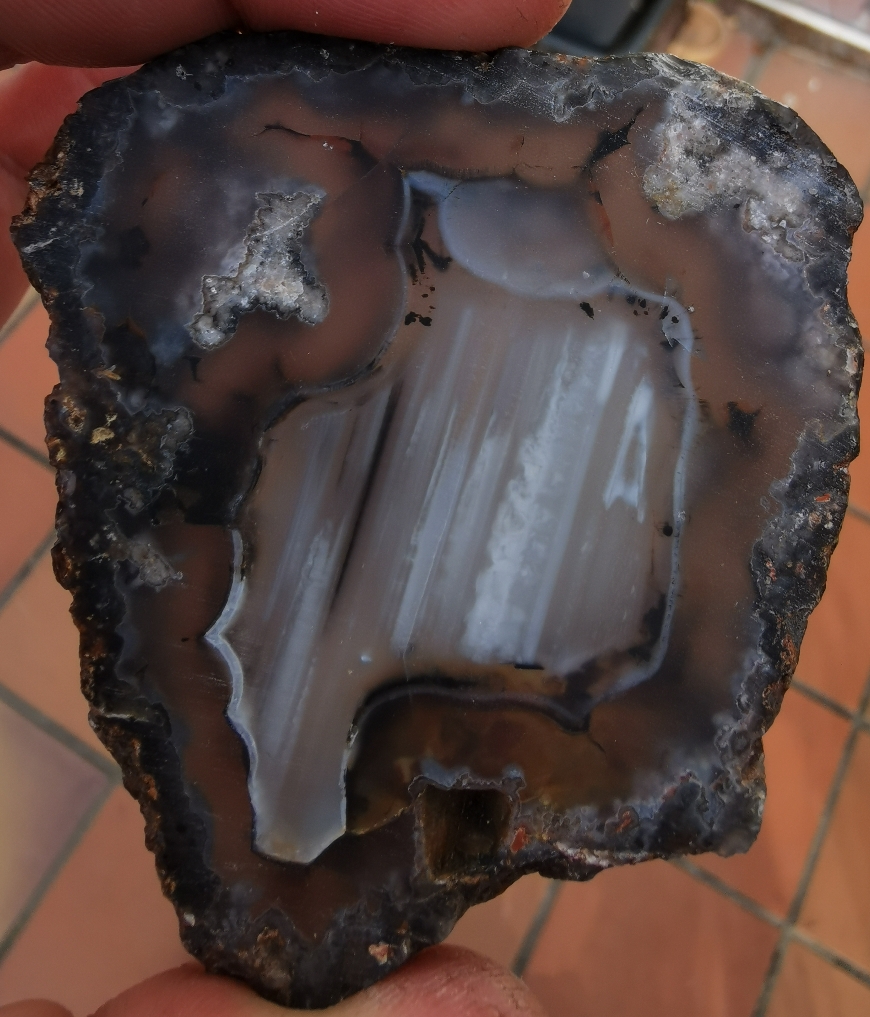 Wenn ich mich nicht täusche, habe ich damals zwei Scheiben daraus bekommen. Da müsste ich jedoch nachsehen, da ich mittlerweile von allen Steinen, die ich bearbeiten kann, eine Scheibe auf Vorrat in einer Kiste liegen habe. Wenn ich mal was brauche, muss ich nicht erst die Sägescheibe wechseln, um zuerst etwas vom Rohstein abschneiden zu müssen.