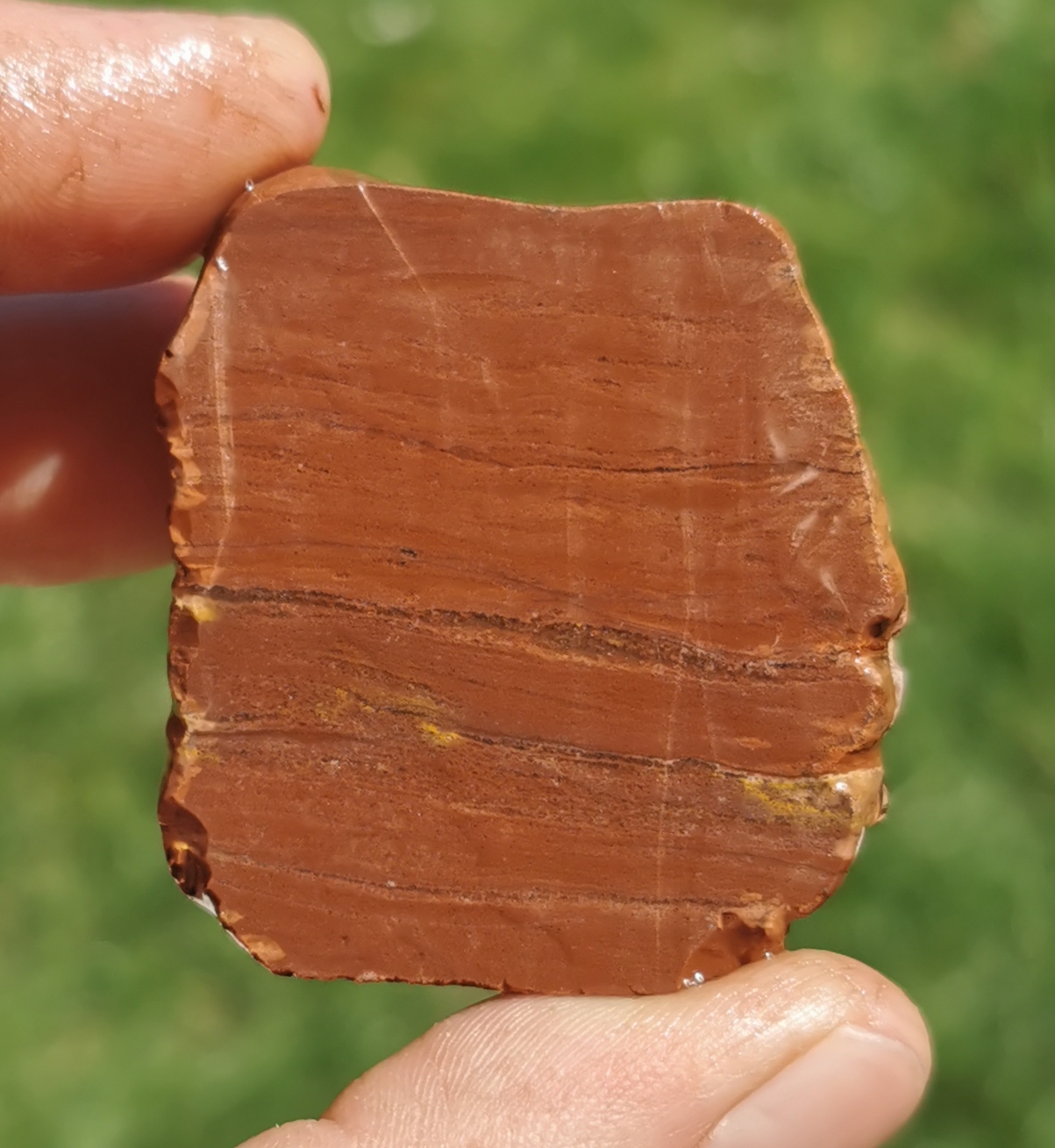 Ich hatte richtig vermutet, der Stein ist durch und durch wie gehofft. Ich bin mir jedoch noch nicht sicher, wie ich ihn am besten weiter bearbeite, denn der Nachteil des Steines ist, dass er im trockenen Zustand nach überhaupt nichts aussieht. Durch die Rauhe Oberfläche ist ein polieren aussichtslos. Mal sehen, wie er nach dem schleifen aussieht. Hier ein Bild im trockenen Zustand.