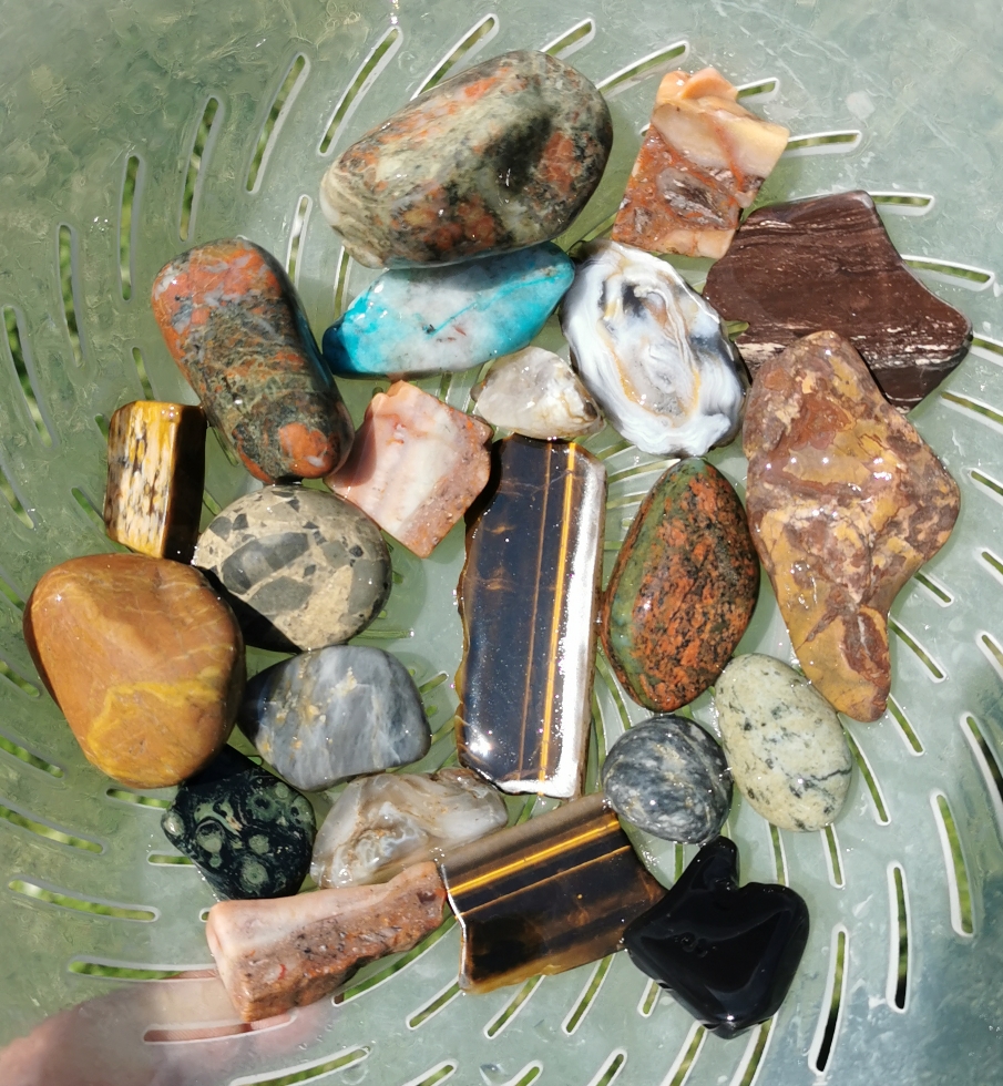 Damit sind die Steine nach 6 Tage trommeln (vorher komplett roh und kantig) wie folgt geworden.