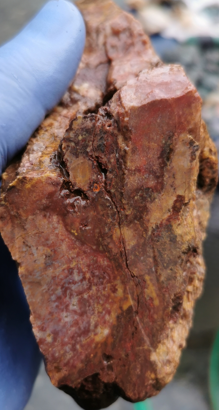 Hier zwei unterschiedliche Appenrode Jaspisse. Aufgeschnitten und als Rohstein.