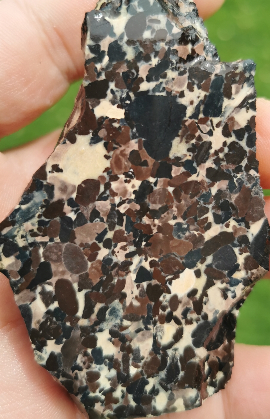 Finde ich nicht, sieht eher wie ein Konglomerat aus, Leopardenjaspisse haben eigendlich mehr rundliche, umrahmte Flecken,