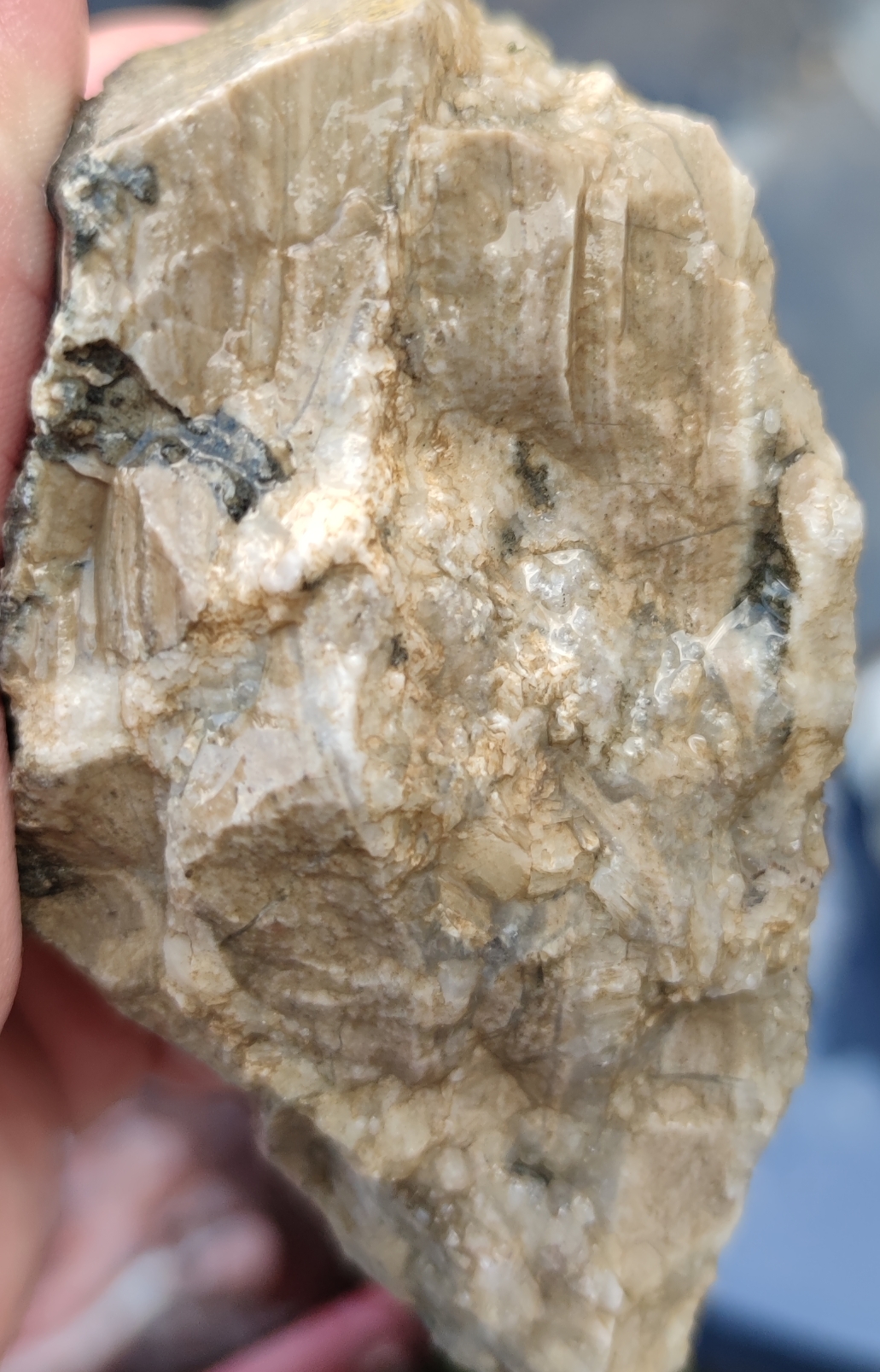 Im Steinbruch sind wir auf eine schöne Calcit Ader gestoßen, von der die besten Stücke bereits auf dem Boden lagen. Eines davon hatte einen sehr dunklen Epidot in sich eingeschlossen.