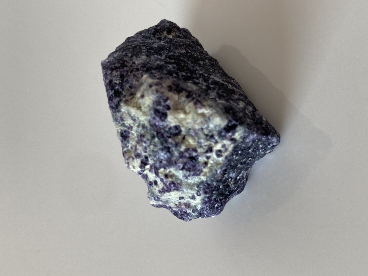 Der Stein ist richtig kräftig lila, undurchsichtig und an der kurzen Seite gelblich. Wenn man den Stein anleuchtet, sind wie Mini-Kristalle zu sehen die glitzern. Evtl Ametyst? Sodalith ist ja eher blau, oder?