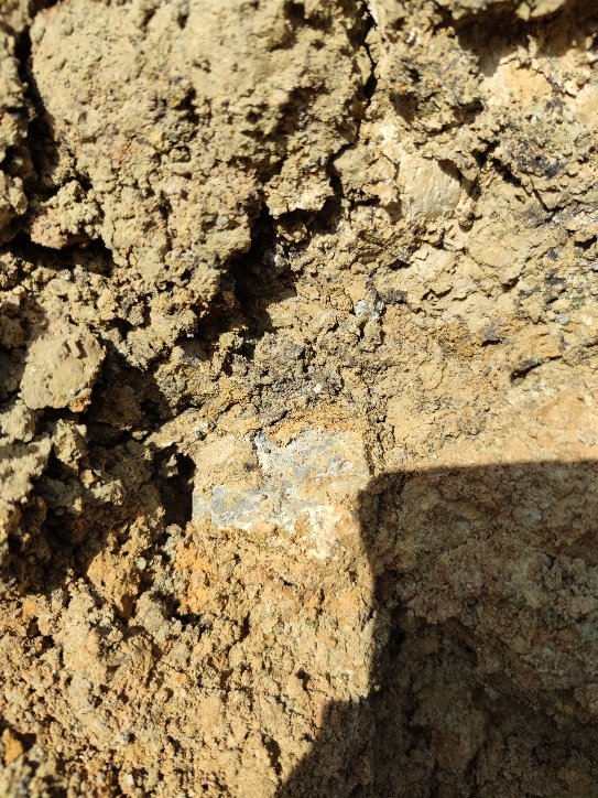 Mitten im Lehm findet man das Blei, oder im Idealfall den Baryt. Da muss man wirklich sehr aufpassen, dass man nicht versehentlich mit der Hacke oder dem Spaten darauf haut. Das passiert leider sehr schnell und so einige Stücke haben wir so verloren.