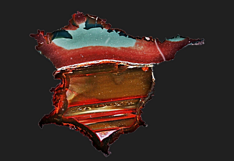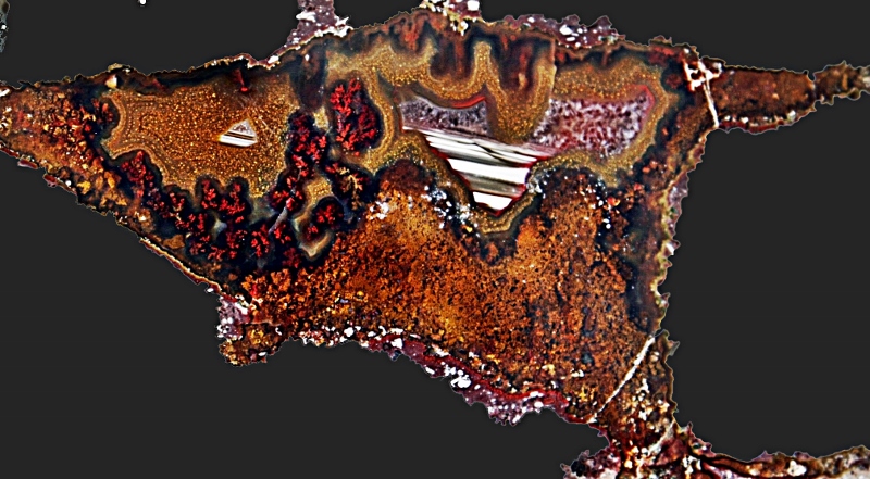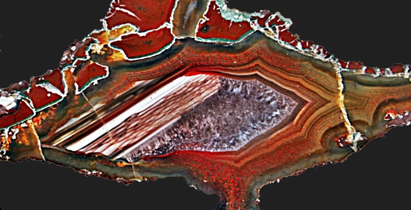 Als Bilder zeige ich einen geschnittenen und polierten Jaspisbrocken sowie Microaufnahmen des Jaspis
