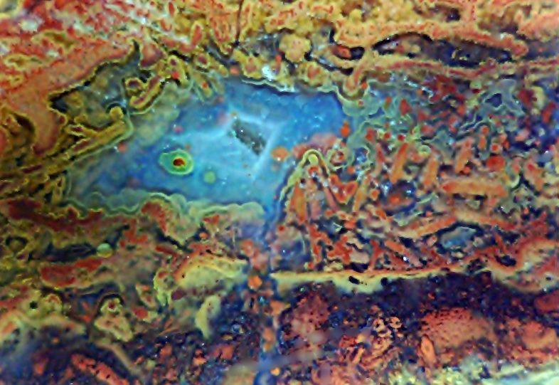 Als Bilder zeige ich einen geschnittenen und polierten Jaspisbrocken sowie Microaufnahmen des