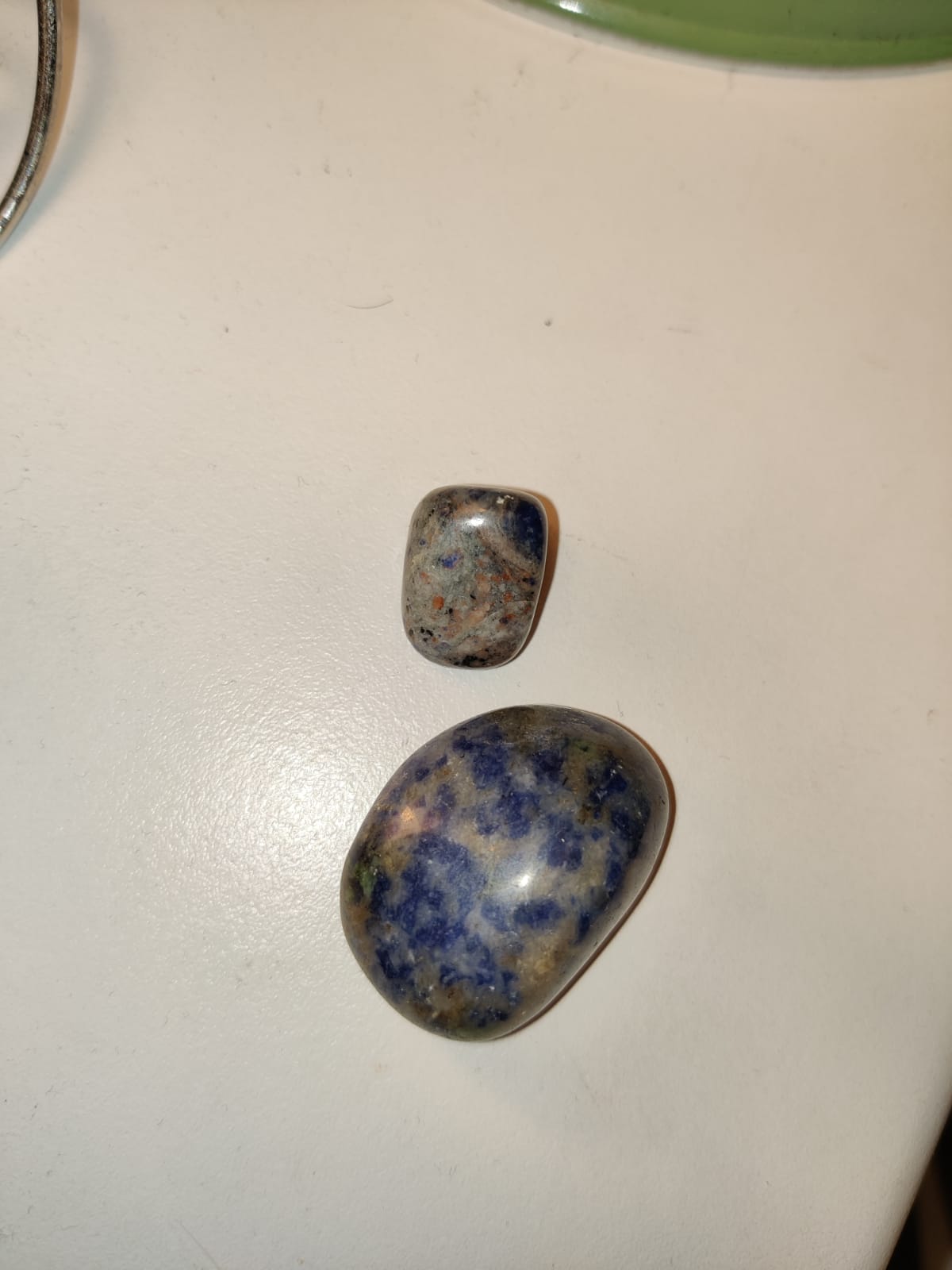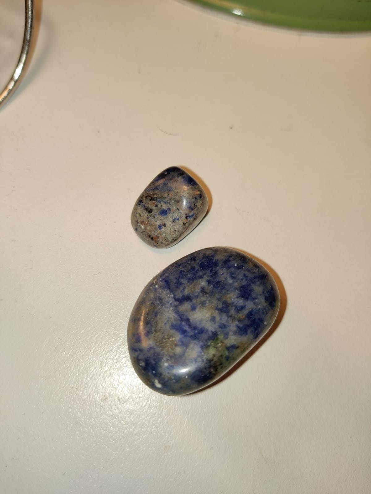 Halle zusammen! wisst ihr zufällig welcher Steine das sind? Sie sind beide sehr ähnlich, deshalb denke ich, sie sind die selbe Art. Könnten vielleicht Sodalith oder Blauquarz sein??