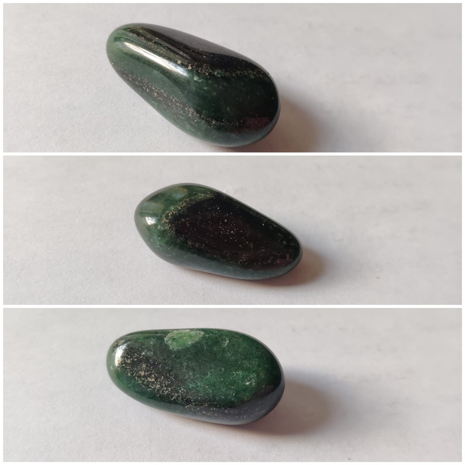 Hi! Der Stein ist dunkelgrün und hat einige silbrig-goldene Sprenkeln. Könnte es ein grüner Aventurin sein?