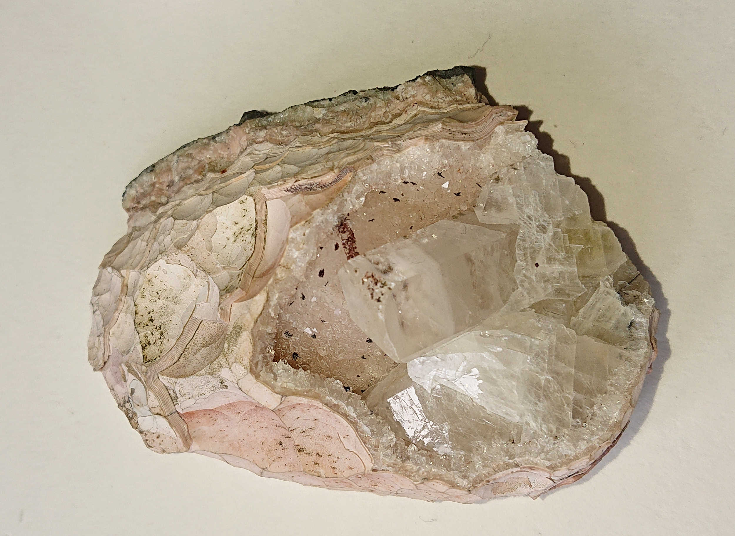 Calcit wohl aufgewachsen auf Rhodochrosit