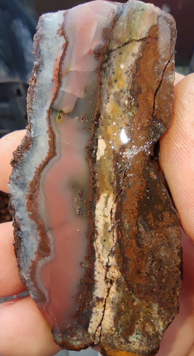 Manche Achate verraten einem schon von außen, was in ihnen versteckt seien wird. So hat zum Beispiel dieses Stück außen kleine absplitterungen, die einem verraten, dass in ihm mindestens die gleiche Farbe steckt, wie bei dem Bild darunter.