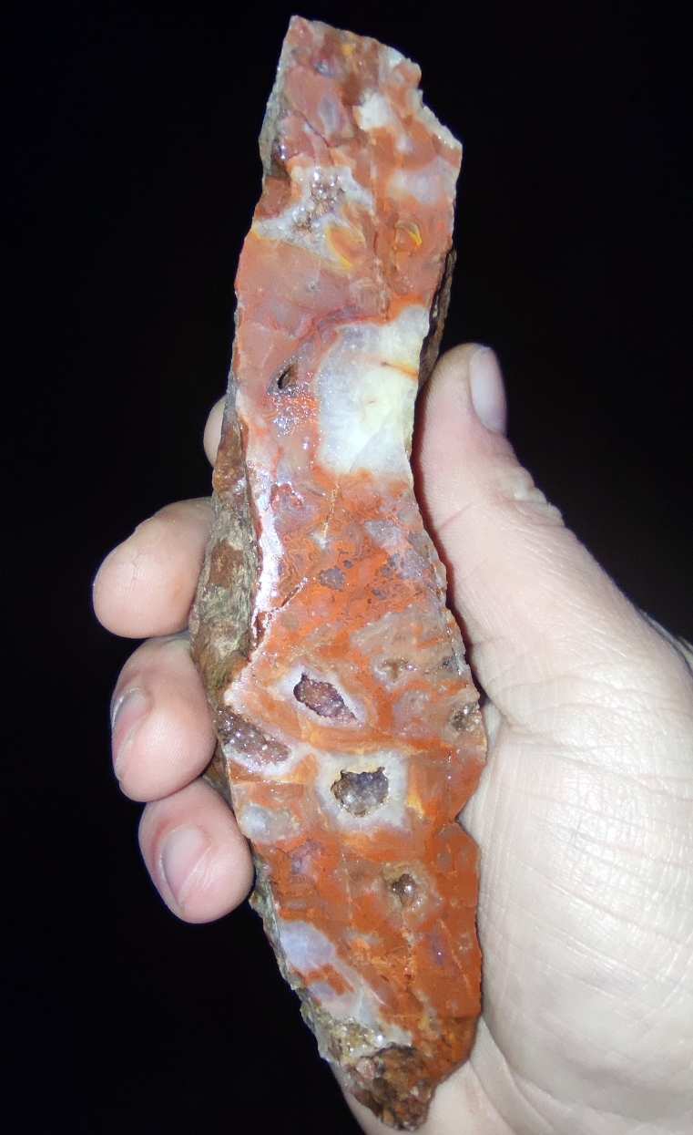 Manche Achate verraten einem schon von außen, was in ihnen versteckt seien wird. So hat zum Beispiel dieses Stück außen kleine absplitterungen, die einem verraten, dass in ihm mindestens die gleiche Farbe steckt, wie bei dem Bild darunter.