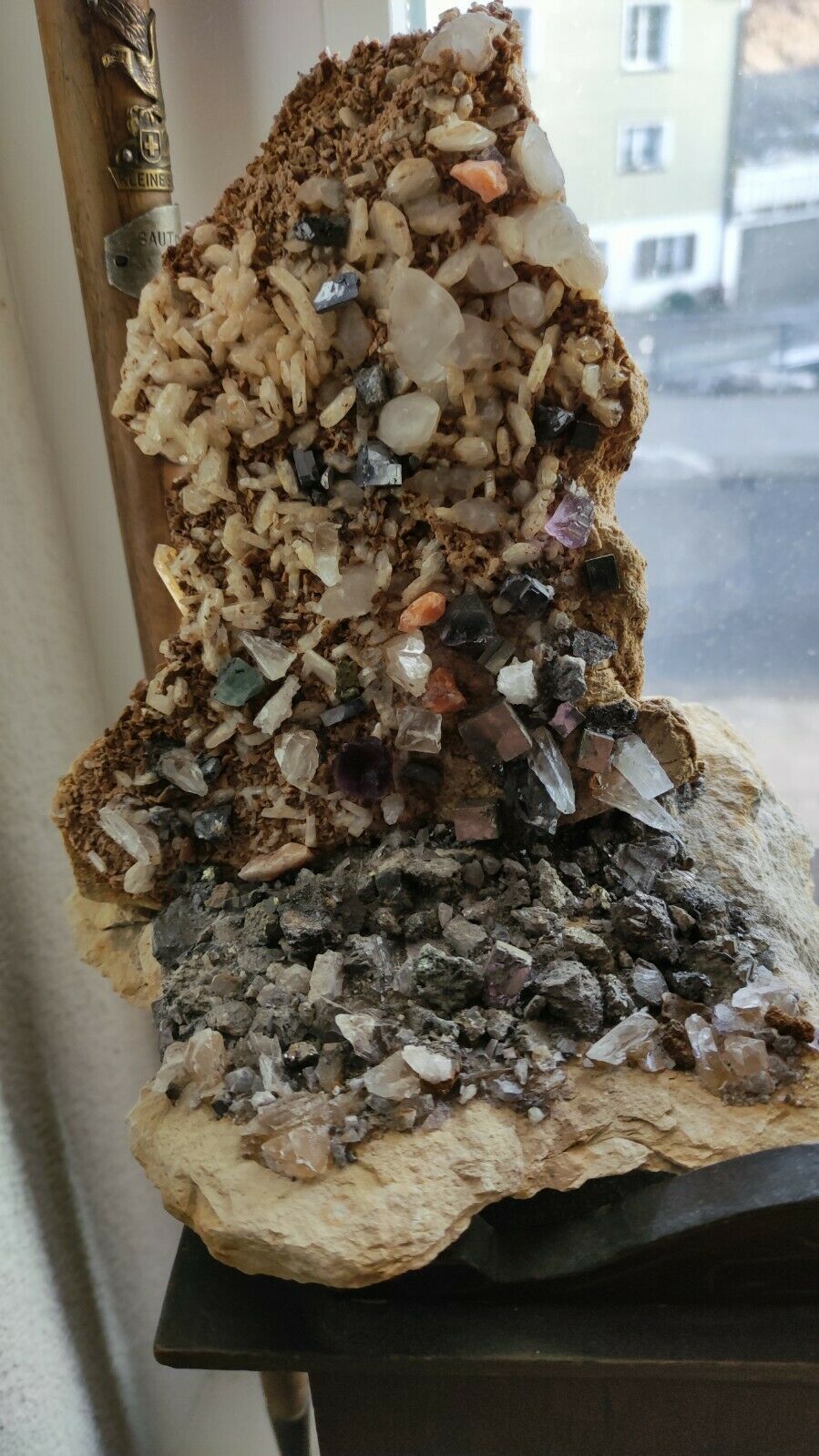 Ich habe so etwas noch nie gesehen und mein erster Gedanke war tatsächlich das einige Steine aufgeklebt wurden. Ich kann mir beim besten Willen so eine Kombi (Bergkristall, Calcit , Galenit , Pyrit , Fluorit ) als einen Stein nicht vorstellen