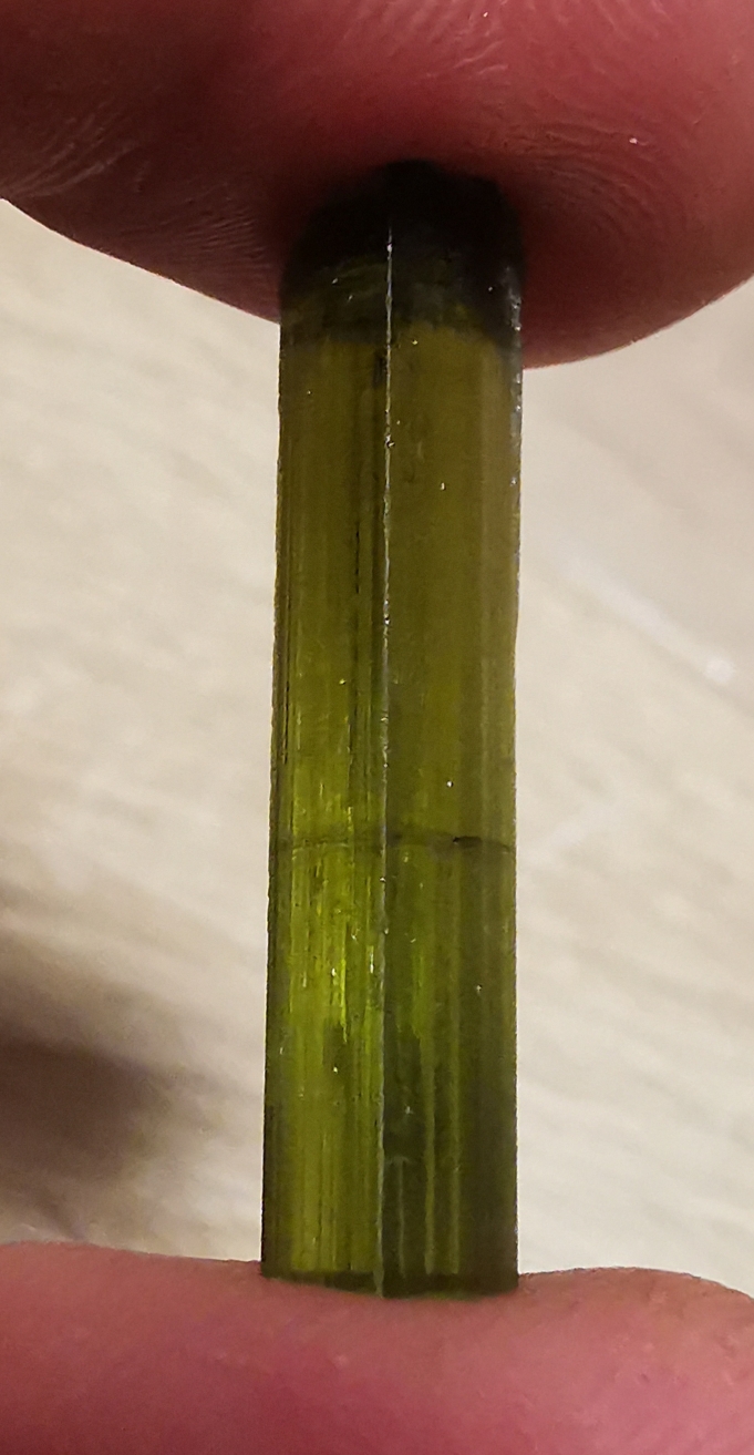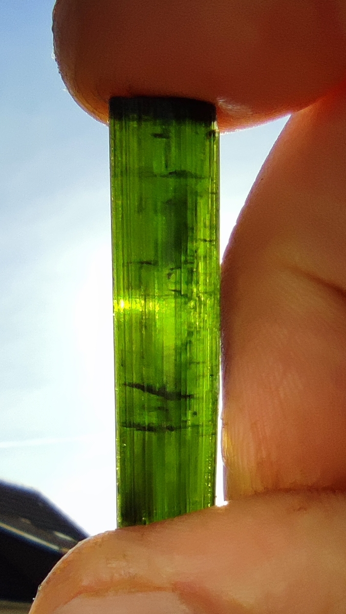 Ich habe heute diesen wunderschönen Turmalin gefunden und konnte ihn einfach nicht liegen lassen. Er hat so einen klaren Grünton, dass man ihn auch ohne Gegenlicht und auf der Haut liegend noch eindeutig als grünen Turmalin wahrnimmt.