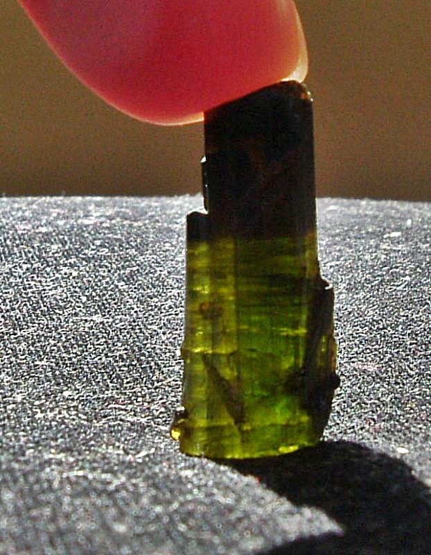 mein lieblingsstück unter meinen turmalinen - ein kl. stück (2,3 cm x ~1 cm x 0,5 cm) verdelith, ein teil der unten gezeigten großen verdelithstufe. ohne durchlicht oder entsprechender lichteinwirkung wirkt dieser verdelith bei bloßer draufsicht fast schwarz.
