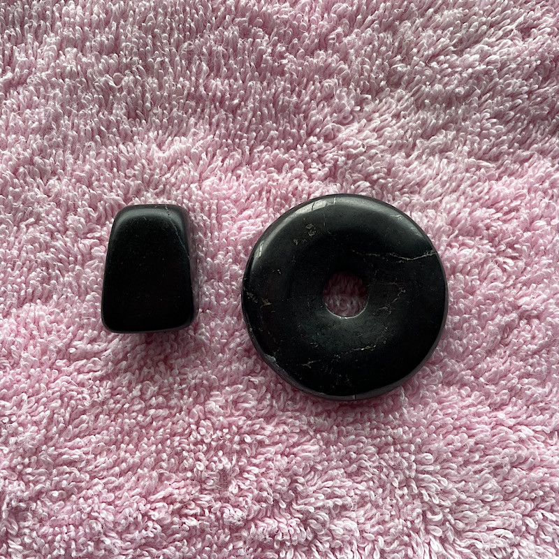 es geht um den Donut im Bild. Daneben habe ich einen Onyx gelegt. Beide Steine sind matt-schwarz, der Donut hat jedoch kleinere weiße Unebenheiten und Risse. Könnte das ein Turmalin sein? Ich hoffe, man erkennt es einigermaßen. Ich wollte noch mit Blitz fotografieren, aber mein Handy wollte leider nicht.