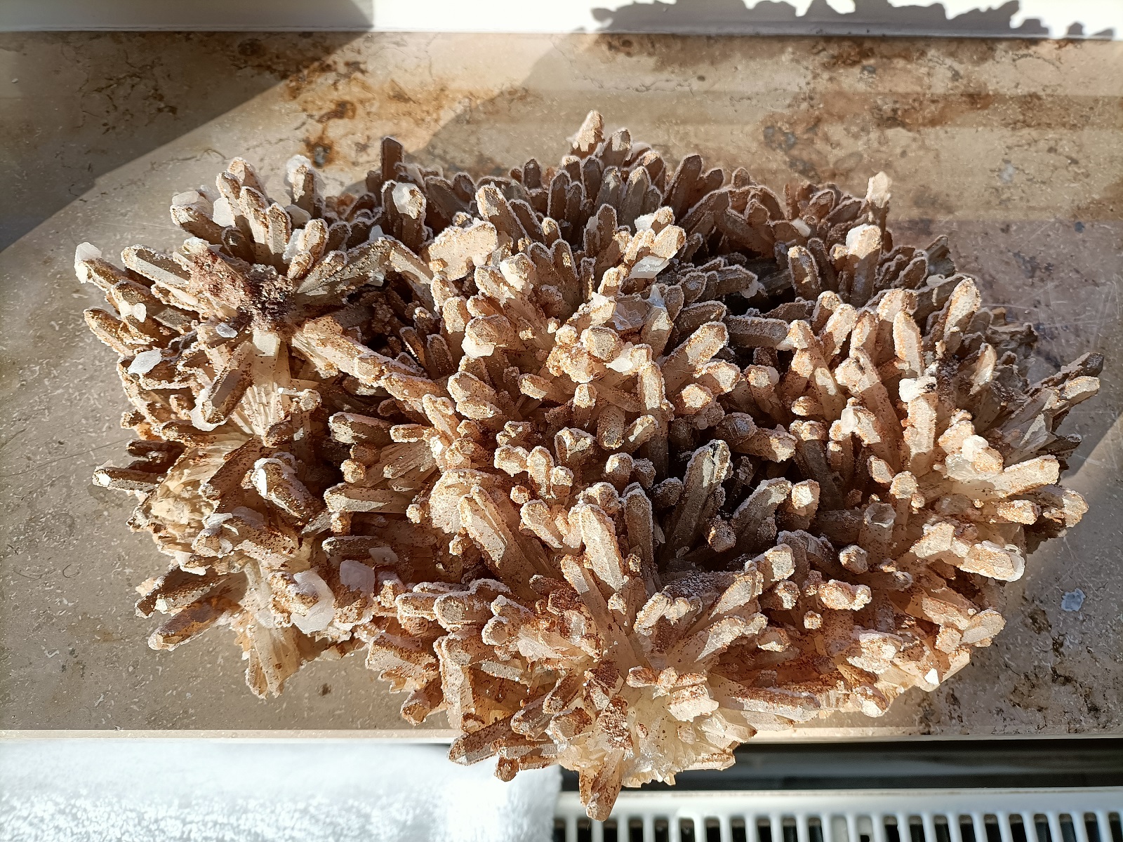 Ich hab ein herrenloses Schildchen in einer Box bei mir gefunden, auf dem Quartz/Siderit/Calcit steht. Bin mir fast sicher, das Schildchen gehört zu dem Stein.